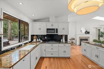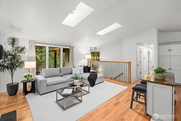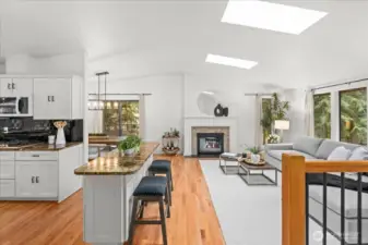Exceptional Mirrormont home on over an acre of private, wooded grounds in the highly sought-after Issaquah School District. A grand timber-frame covered front porch creates a stunning Northwest arrival and welcoming first impression. Inside, soaring ceilings and abundant natural light—enhanced by a brand-new roof with expansive skylights—create a bright, open atmosphere that lives beautifully year-round.The updated kitchen features a gas cooktop and modern finishes, ideal for both daily living and entertaining. The spacious primary suite offers a private retreat with custom closet, spa-inspired ensuite bath, and direct access to the peaceful outdoor setting. Two additional bedrooms and a full bath complete the main level.The lower level with separate entrance offers incredible flexibility with a large living area, wood stove, two bedrooms, office, and bath—perfect for multigenerational living, guest suite, or home office. Major upgrades include a brand-NEW roof, new HVAC with A/C, new water heater, an automatic standby generator, and sprinkler-irrigated grounds—offering comfort, efficiency, and peace of mind year-round. Custom paver patios and gas BBQ hookup create ideal outdoor entertaining spaces. Enjoy privacy, nature, and modern comfort just minutes to Issaquah, trails, and amenities.