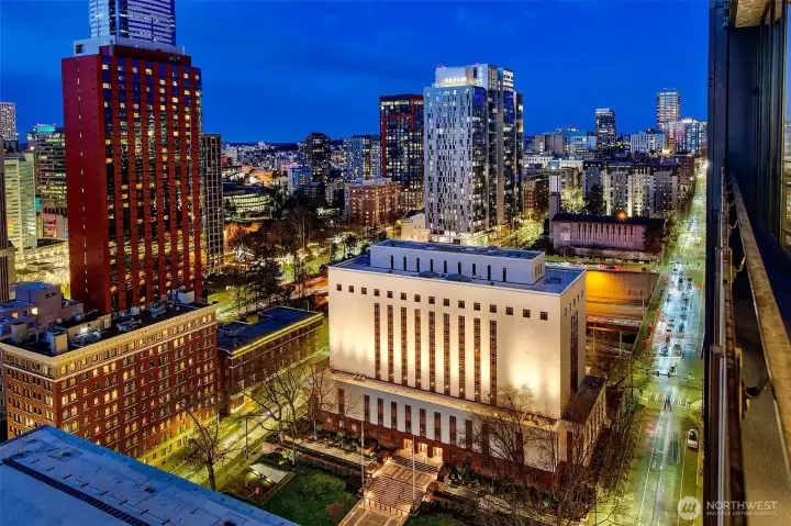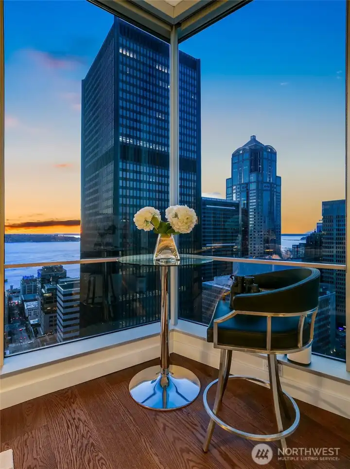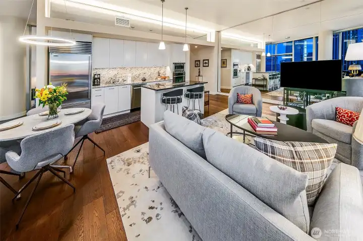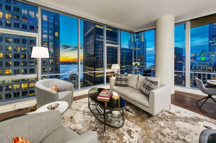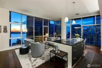 Penthouse Style luxury from this 23rd floor NW corner Jewel box! Near 1250 sqft -1bd plus large den. Soaring 11 foot floor to ceiling windows wrap this private sub penthouse home. Dream remodel, enjoy over 100k of designer upgrades, new wide plank floors, cook with a view-custom island designed with new wolf induction cook top, discreet pop up fan & sleek beverage center. Top of the line appliances, subzero, new LED lighting in kitchen above & below cabinets new designer lighting in dining area, new kitchen granite, sink & faucet, new Bosh dishwasher. Home has A/C . World class building, 24story, 126 homes, only 6 per floor, LEED Gold, steel & concrete. 5star location, mins to stadiums, I5, light rail, hospitals, court house. 1 parking- 1 storage. Be sure to visit 2nd floor amenities, owners lounge with roof deck, guest suite, fitness center & pet relief. Great HOA with healthy reserves! No rent cap.