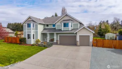 Stunning Penn Cove home with water views & exceptional outdoor living. Welcome to this beautifully maintained two-story home offering the perfect blend of elegant living and Pacific Northwest lifestyle. Nestled on an expansive lot in a private neighborhood with partial water views of Penn Cove, this property is truly one of a kind. The main level impresses immediately with rich flooring, coffered ceilings, and a cozy gas fireplace anchoring the spacious living room. The gourmet kitchen features dark cabinetry, granite countertops, stainless GE Profile appliances, a large center island, and a walk-in pantry — all flowing seamlessly into the dining area and out to the backyard patio. Upstairs, the generous primary suite offers a walk-in closet and a spa-inspired ensuite bathroom with soaking tub and glass shower. A second bedroom, craft room, office, large bonus family room, laundry, and a thoughtfully appointed full bathroom complete the upper level. Outside, enjoy a massive fully fenced backyard with a patio, fire pit seating area, greenhouse, raised garden beds, and even a charming chicken coop. The property also features dedicated RV/boat parking, two storage sheds, and a large 3-car garage complete with a storage loft. The home is wired for a whole-house generator & central vacuum. All of this just minutes from downtown Oak Harbor, Whidbey Island beaches, NAS Whidbey Island, and even a drive-in movie theater! This is island living at its finest.