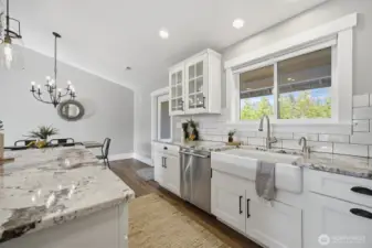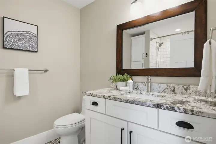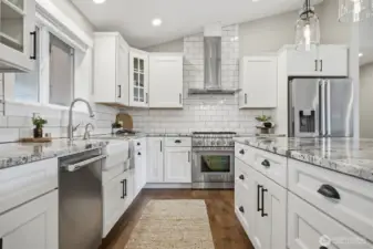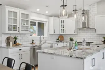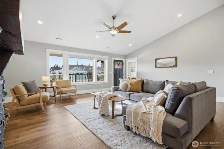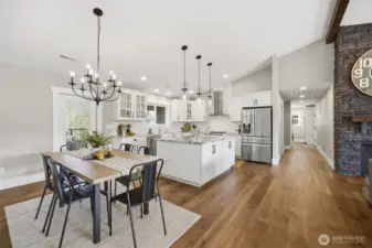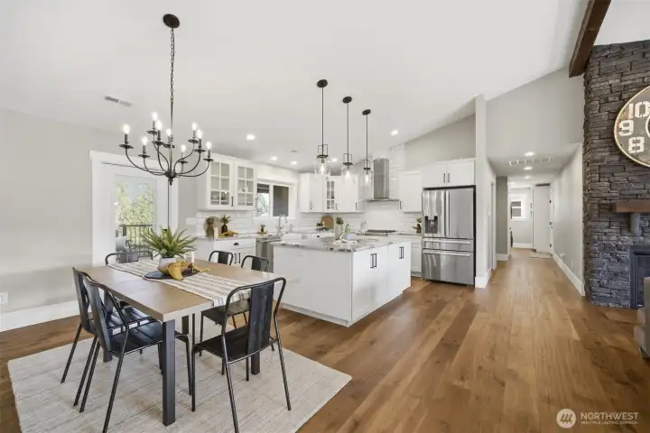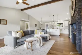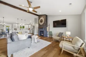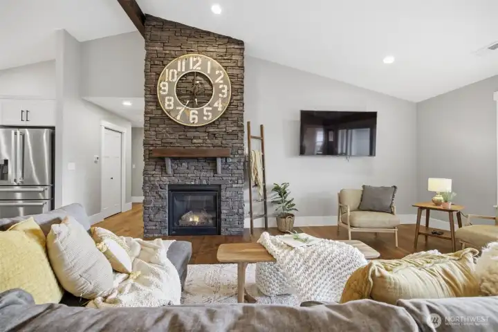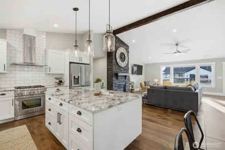 Thoughtfully upgraded single-level living up the hill in Everson — this 3-bedroom + office home is loaded with high-end finishes and outdoor amenities that set it apart from the rest. Step inside to rich wood floors, soaring 12-foot ceilings anchored by a dramatic rock-face gas fireplace, and a massive statement beam that defines the living room. The chef's kitchen impresses with Thermador range and dishwasher, granite countertops, higher-grade cabinetry, a country sink, subway tile, and a walk-in pantry. Bathrooms offer a spa-like feel with heated tile floors and full tile surrounds on tubs and showers from floor to ceiling. Outside, enjoy professionally landscaped grounds with an in-ground irrigation system, decorative boulders, fruit trees, and a fully fenced private backyard — perfect for entertaining on the back deck. A convenient sidewalk connects the deck to the front of the home. Additional upgrades include a water softener, brand-new furnace (1 year old), generator switch on the electrical panel, a storage shed, and a striking rock-face exterior with professional fencing. Abundant natural light throughout. This one truly has it all.