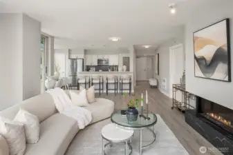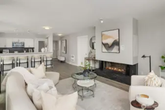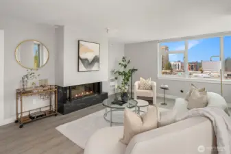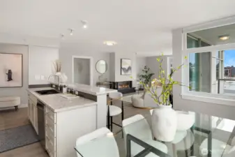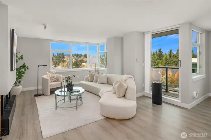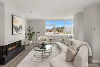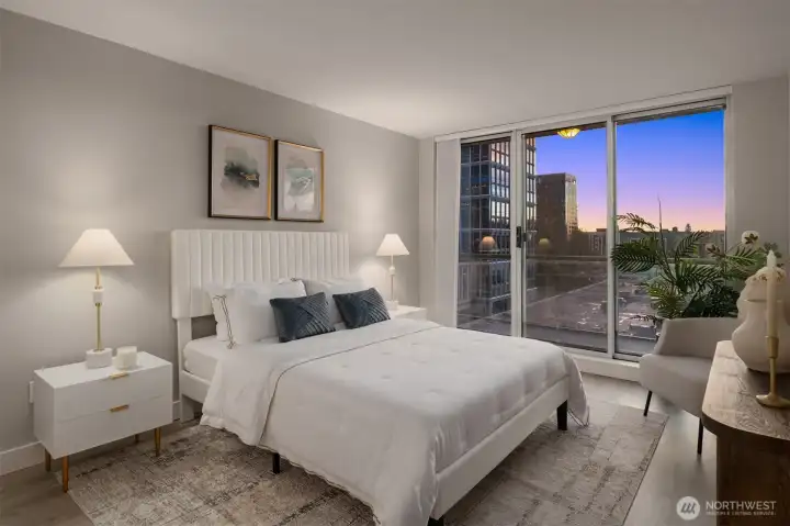 [Luxury Downtown Bellevue Living] Experience refined corner-unit living at The Palazzo, where sunset views and an unbeatable location come together. This beautifully updated 2-bedroom, 1.75-bath (2 parking spots - 2 balconies) residence offers a light-filled, open layout with expansive windows and a spacious living area anchored by a cozy fireplace. Designed for both comfort and lifestyle, the home features two private balconies—one off the living area and breakfast nook with west-facing sunset and northern territorial views, and a second off the primary suite, perfect for unwinding at the end of the day. The kitchen is equipped with stainless steel appliances, granite countertops, and a breakfast bar, seamlessly connecting to the dining space and living room. Don't forget the brand new automatic blinds throughout the home. The primary bedroom is a true retreat, showcasing a wall of windows, city views, balcony access, and a fully renovated ensuite bath, while the second bathroom has also been tastefully updated. Additional highlights include in-unit laundry and two secured, spacious side-by-side parking spaces—a rare and highly desirable offering in downtown Bellevue. Palazzo amenities include concierge service, fitness center, rec room with full kitchen, guest suite, and conference room, all just moments from parks, shopping, dining, the library, and light rail. No rental cap!