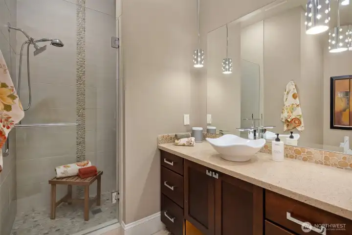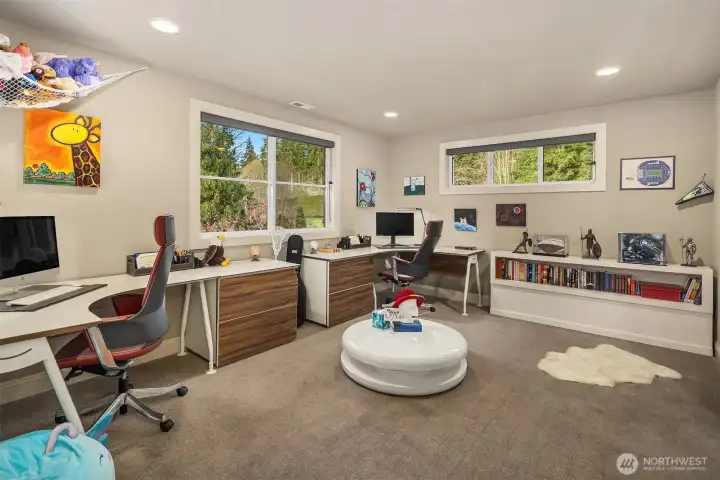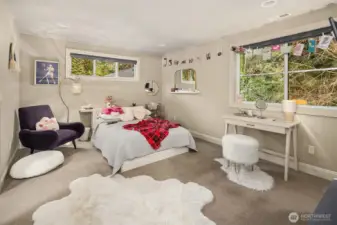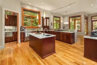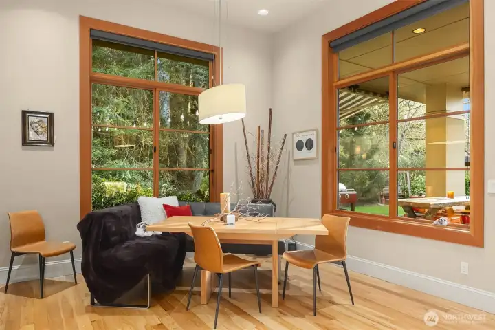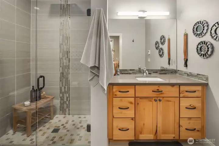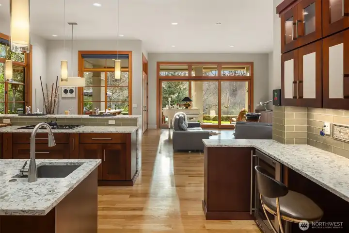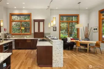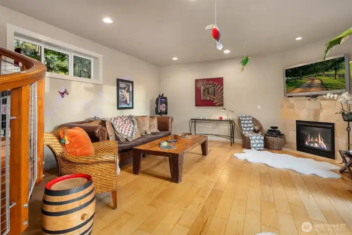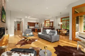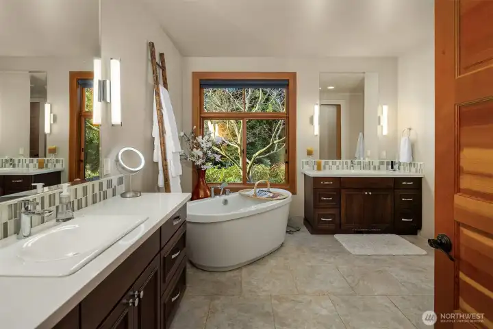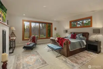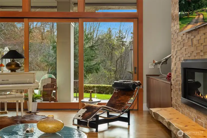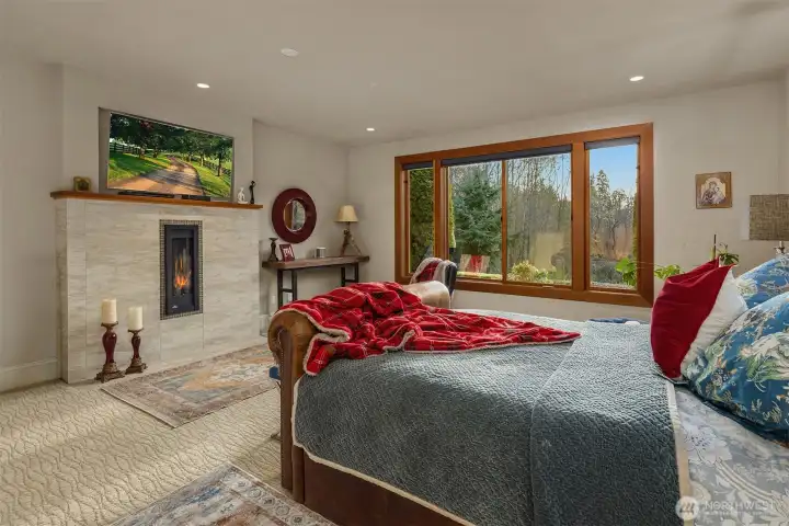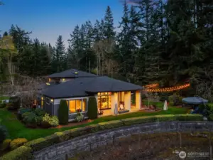 Tucked in coveted Woodway on a private 2+ acres this luxurious 5-bed modern PNW retreat offers a rare blend of tranquility & unmatched design that lives like a rambler. An open-concept layout showcases seamless indoor-outdoor living with Fleetwood doors extending to a covered patio and expansive entertaining spaces. A striking floor-to-ceiling stone gas fireplace anchors the main living area, creating a sophisticated focal point. Gourmet kitchen both stunning and functional, featuring waterfall quartz countertops, full butler’s pantry, and premium Thermador and Fisher & Paykel appliances. Effortless flow to the formal dining area makes this home ideal for hosting. Hardwoods throughout the main. Primary Wing with own fireplace & en-suite 5-piece bath, spacious double vanities, soaking tub & spacious walk-in shower. Attached MIL with gas fireplace, full kitchen, ¾ bath, & laundry. Curved wood-wrapped staircase to loft adds character. Perfect for guests, office, or creative space. Sprawling 4-car heated garage complete with workshop & showroom-style finish. A truly rare Woodway property with its own little vineyard! Luxury, privacy, & thoughtful design