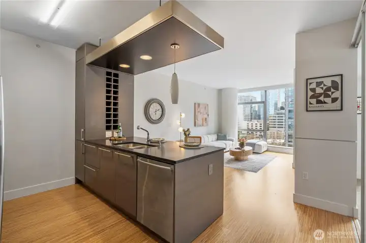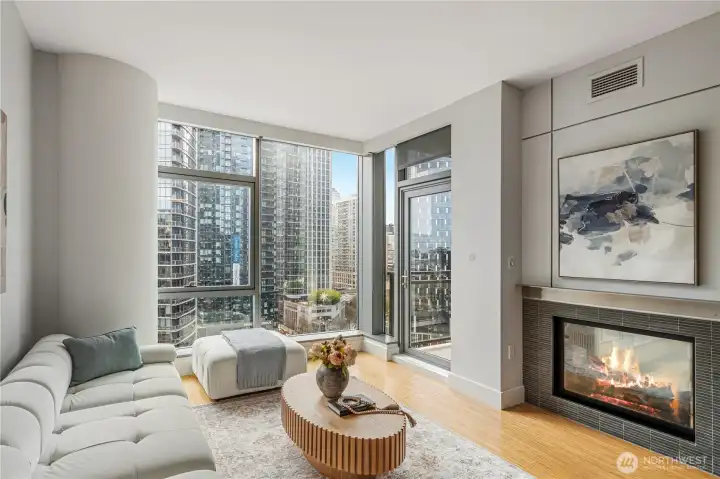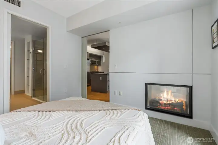 Experience elevated living at Enso, a modern building in South Lake Union offering concierge service, fitness center, resident lounge, and more. This unit features one of the building’s most desirable and functional one-bedroom layouts, with excellent flow and usability. Floor-to-ceiling, south-facing windows fill the home with natural light and frame unobstructed city views. A rare dual-sided gas fireplace adds warmth and character, creating a seamless connection between the open living area and bedroom. The well-appointed kitchen anchors the space, featuring Bosch appliances, granite countertops, and sleek modern finishes. Enjoy unmatched convenience with Amazon, Whole Foods, dining, and transit just steps away. Secured parking and private storage included. Pet-friendly building with no rental cap, offering flexibility for both homeowners and investors.