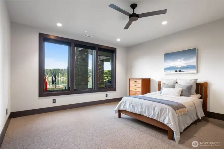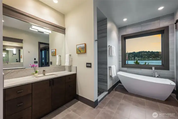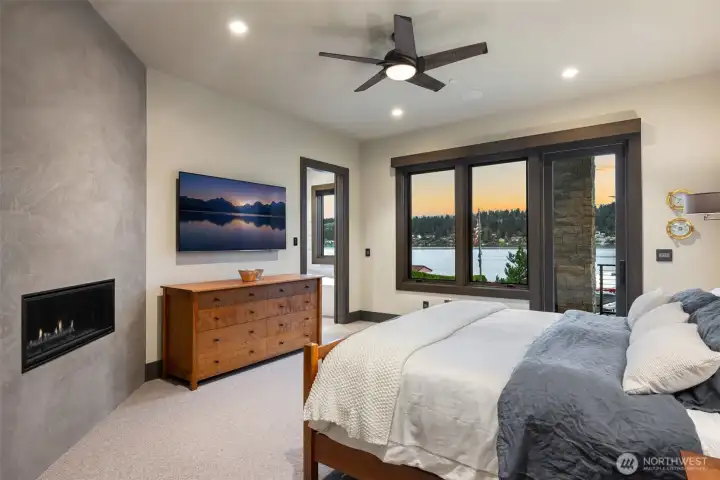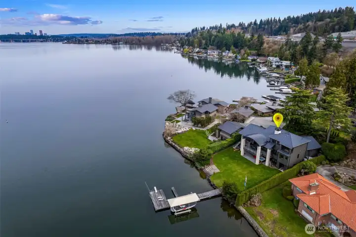 Experience modern luxury at its finest in this west-facing custom Lake Washington residence, boasting sunset views, and nestled on a quiet, private lane in Bellevue’s coveted Pleasure Point. This waterfront masterpiece bathes in natural light and frames ever-changing lake vistas from nearly every room. Sleek custom finishes create a refined palette of contemporary elegance. A dramatic entry opens to expansive living spaces with seamless indoor–outdoor flow that transforms the home into a serene retreat or a vibrant entertaining venue. The gourmet kitchen is a chef’s dream, featuring professional grade Wolf/Sub Zero appliances, a generous quartzite island, and lake views that elevate everyday living. The main level primary suite offers a spa-inspired bath with heated floors, a decadent soaking tub, and a vast walk-in closet with organized storage. Additional spaces include thoughtfully designed bedrooms, a dedicated home office, and a lower-level family room for versatile living. Discover refined minimalism united with timeless elegance as this residence that transitions from tranquil daily living to memorable waterfront entertaining. A wine cellar complements the ambiance, while a saltwater hot tub invites relaxation after a day on the water. Your premier waterfront lifestyle, blending contemporary design with timeless luxury, awaits on the shores of Lake Washington.