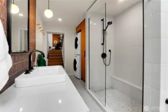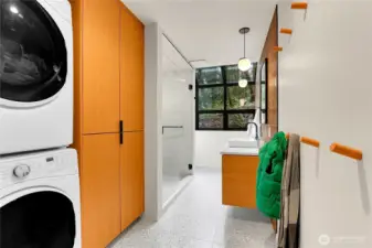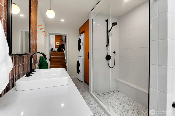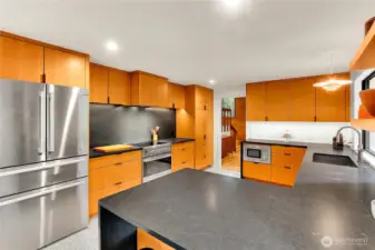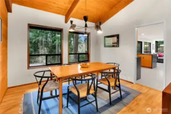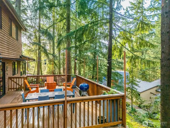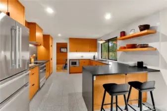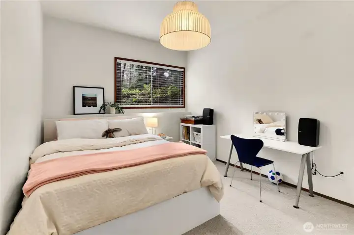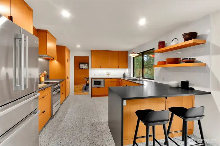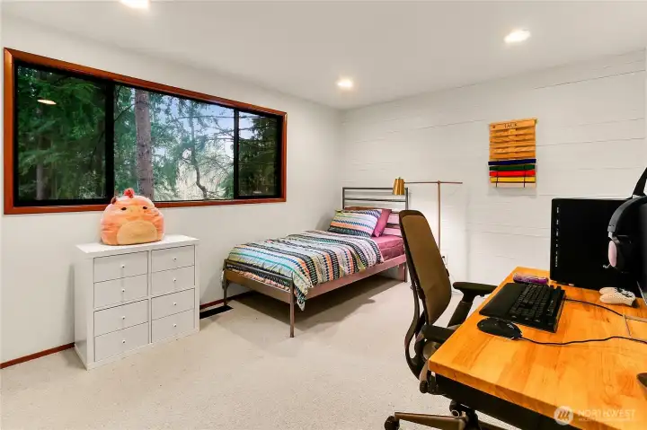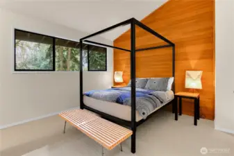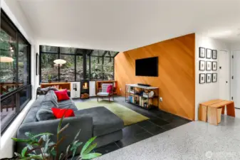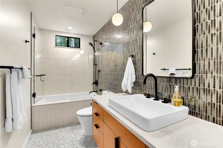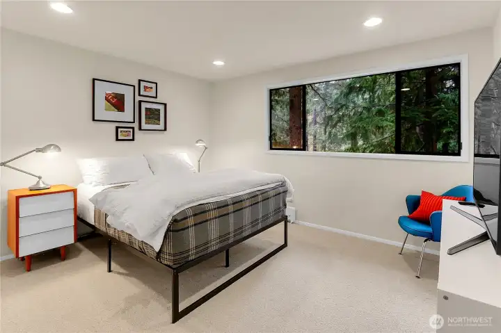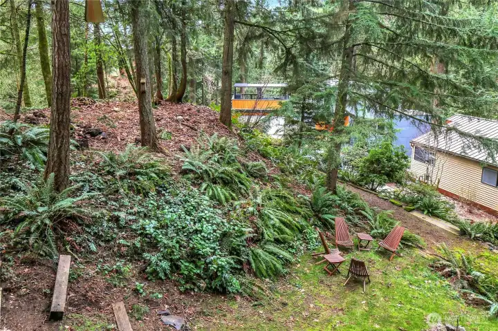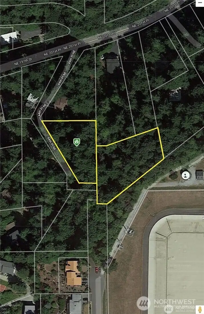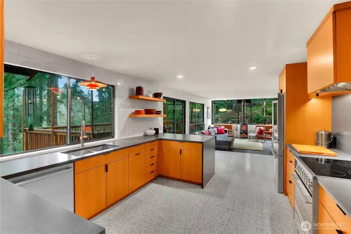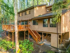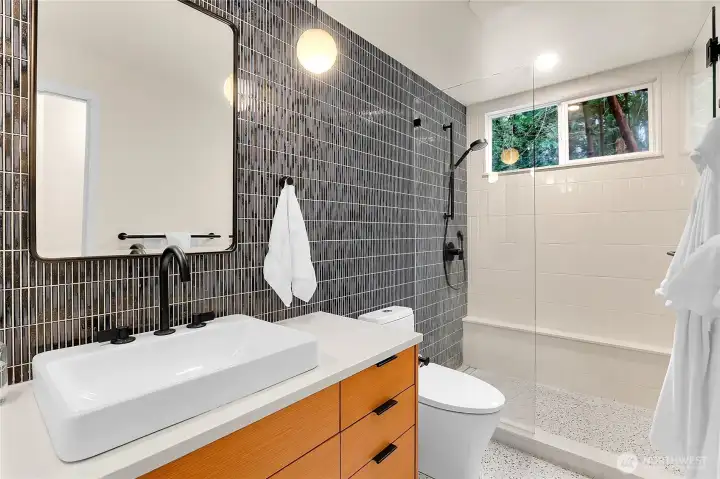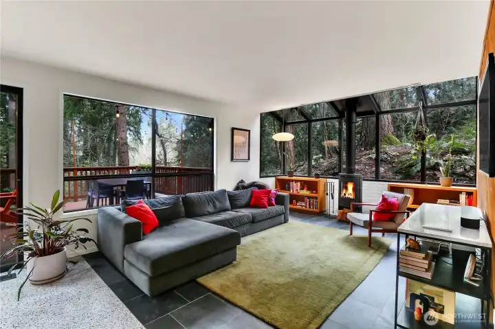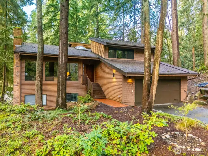 Designer and Project Manager owners with incredible eyes for detail have achieved an extraordinary remodel of a classic Pacific Northwest Modern. The best materials, craftspeople, and timeless design elements combine in this private one acre retreat nestled in the trees at the top of a private lane. Gorgeous cedar ceilings enhanced by hardwood, slate, terrazzo, and wool carpet flooring. Floorplan offers wonderful separation of living spaces and flexibility. Vaulted ceiling entry/living room with skylights and fireplace. Chefs kitchen with Bosch & Fisher Paykel appliances bridges dining room and family room with wood burning fireplace. Three bedrooms and two baths on the upper level include a primary suite with private bath and walk thru closet. Additionally, two bedrooms on the lowest level work well for guests or as home office. In all, three beautifully remodeled bathrooms with heated floors and custom floor to ceiling tile. Two car garage AND...Coveted LFP Civic Club- deeded beach rights! Two separate lots combine to over 1.1 acres! Vacant wooded lot is deemed buildable by City of Lake Forest Park and has a private trail that connects the top of the property directly to Horizon View Park! Build another home, keep it as a private reserve, or sell it separately.