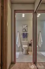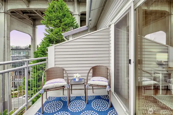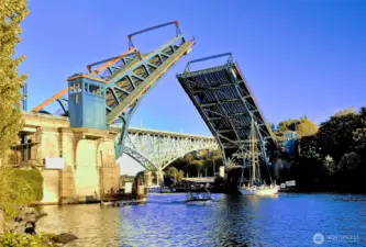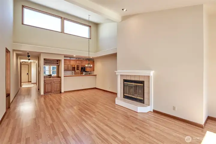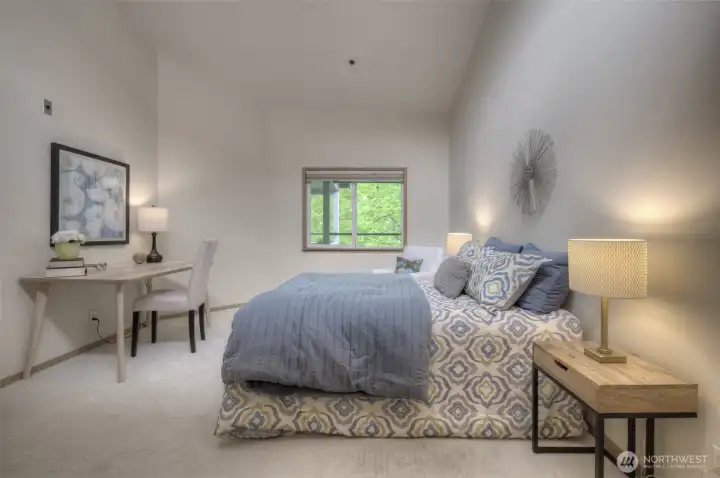 Fremont's vibrant "Center of the Universe" is the location of this top floor, 2 primary bedrooms, single level plan with soaring vaulted ceilings, spacious, sun filled rooms with clear story windows & 4 skylights throughout. Open kitchen, dining & living area, wood burning fireplace, Primary suite with walk-in closet and a second suite with double closets! Intimate building conveniently located to the business hub for several tech offices, restaurants, shops, public library, Burke Gilman Trail, Lk Washington Rowing Club to name a few village amenities. Inviting South facing deck is the perfect spot for container gardening. Peek-a-boo view of marina on Lake Union and Queen Anne Hill just across the beloved Fremont bridge. Freshly painted and move-in ready! Pet friendly!