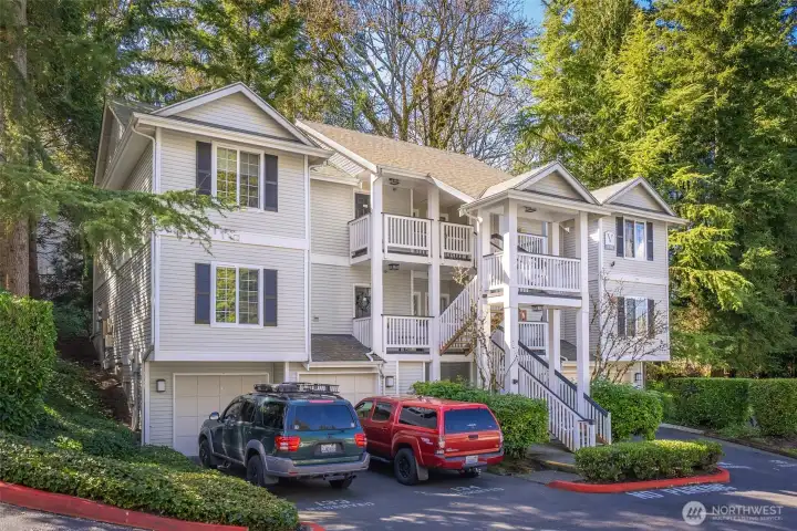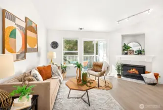Perfectly positioned between Bothell and Woodinville, this well-appointed condo offers easy access to I-405 and SR-522, placing you just minutes from everyday essentials and less than 10 minutes from Woodinville’s renowned wineries, dining, and shopping. Step inside to a recently refreshed interior featuring vaulted ceilings, creating a bright and inviting atmosphere. The dining area provides a comfortable space for hosting, while the living room centers around a cozy fireplace, ideal for relaxed evenings at home. The well-maintained kitchen offers ample prep space and storage, while the private balcony overlooks peaceful greenery and includes an additional storage closet. The primary suite features dual closets and a private ensuite. Down the hall, a second bedroom and a nearby full bath offer flexibility for guests or a home office. This condo is complete with in-unit laundry, an oversized one-car garage, and an additional dedicated parking space, offering both comfort and convenience.
