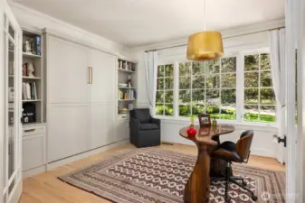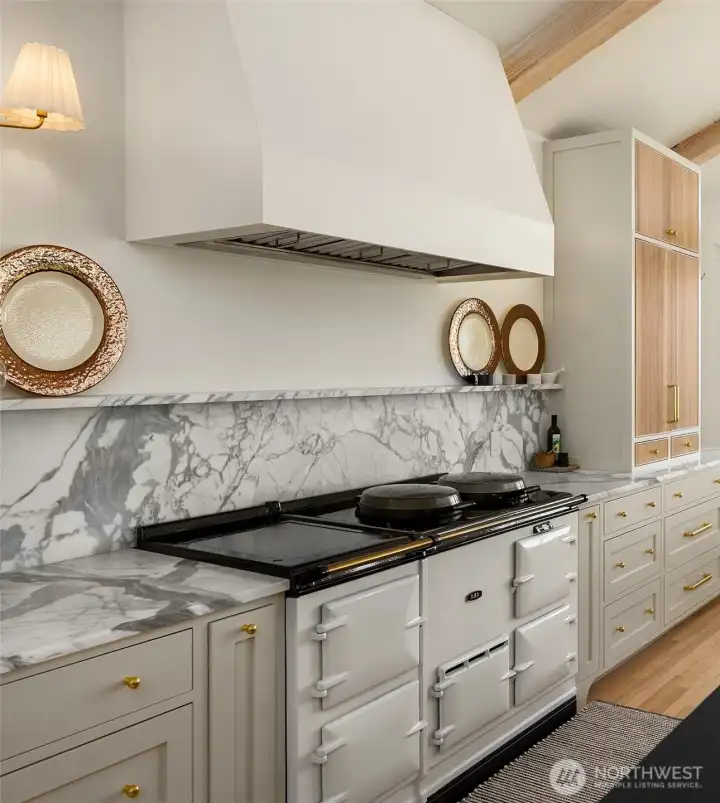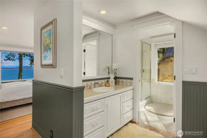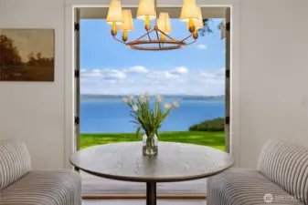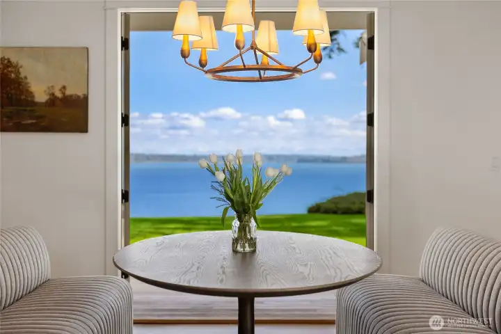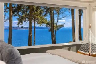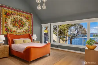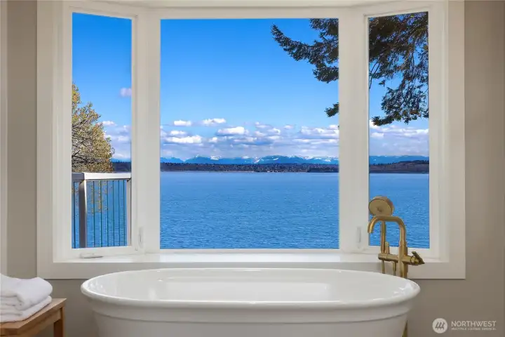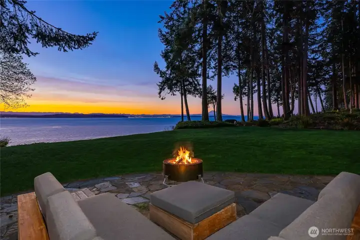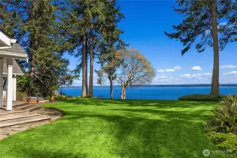 Rare Bainbridge Island waterfront offering with protected, panoramic water views from a fully bulkheaded high-bank setting, capturing stunning sunrises over Downtown Seattle, the Cascades, Mt. Rainier, and the ever-changing maritime activity along the shipping lanes. A private tree-lined drive opens to a near-circular driveway, creating a quiet, stately sense of arrival, set within a rare, fully level 1-acre parcel. Designed in a timeless Coastal Craftsman style, the home has been extensively reimagined with over $1M invested, encompassing magazine-worthy design alongside meaningful infrastructure and system upgrades. The interior unfolds with a natural, connected flow, well suited for both everyday living and entertaining, with views from nearly every room. The expansive kitchen is stunning, with vaulted ceilings, a new AGA range, a generous island, and a sunlit breakfast nook, all oriented toward two walls of windows that capture breathtaking eastern and southern views. The home offers 3 bedrooms, each with its own ensuite, along with a Murphy bed in the office. The primary suite is a true retreat, with sweeping views, a deck, dramatic vaulted ceilings, a walk-in closet of exceptional scale, & a spa-like ensuite bath with sauna. A covered mahogany view deck extends from the kitchen, dining room, and living room, complete with integrated heaters, and opens to an expansive, flat lawn set against commanding views. Ideally located near Fay Bainbridge Park & Rolling Bay's shops.
