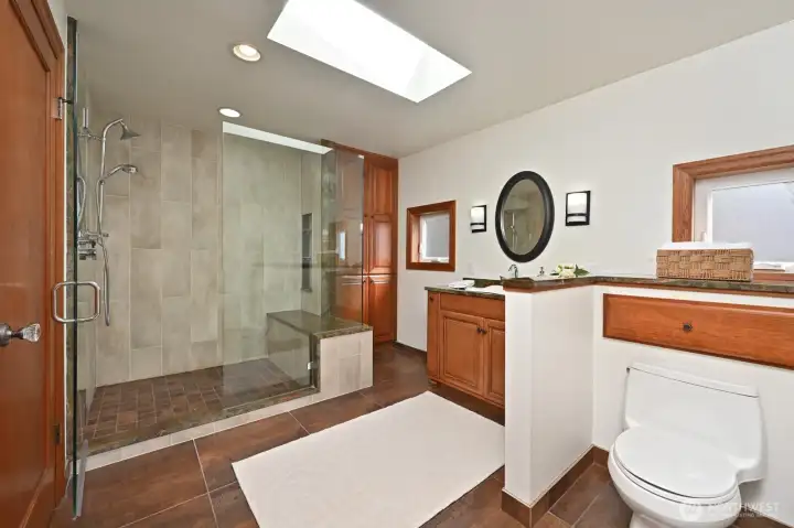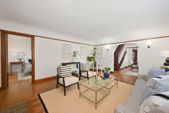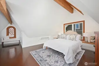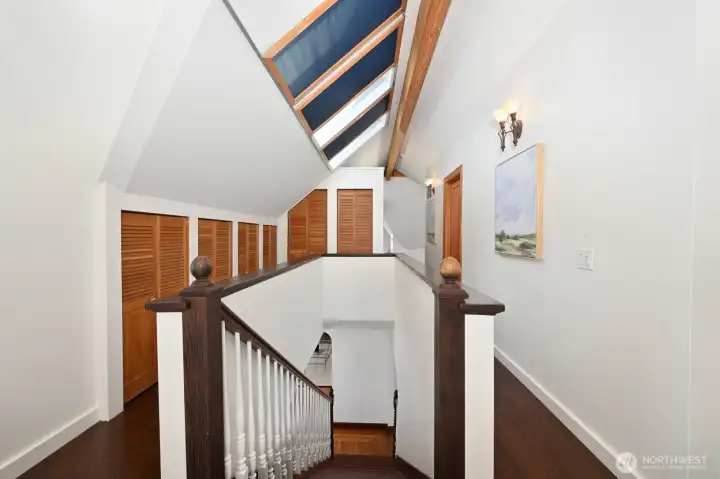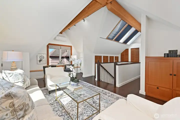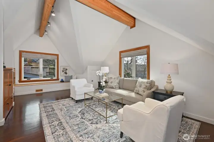 Walk past the amazing climbable tree, and up the manicured front yard to approach this gorgeous 1929 tudor full of old world charm with thoughtful updates. Beautifully maintained throughout with original wood floors, picture rails, coved ceilings, and wood windows that fill the home with an abundance of natural light. Upper level has a very full primary suite with a living room, a sitting area and a small office space. Added sunlight with custom skylights with personalized coverings for those extra sunny days. Main floor has 3 bedrooms, a full bath, a kitchen with fir windows and deep sills, coved dining room, plus the large living room with a cozy fireplace. The daylight lower level is full height with ample storage and a third bathroom and a cove big enough for another office or play space. Easily access the private, storybook backyard setting with a deck, a patio, water feature, and charming treehouse— all designed perfectly for relaxing or entertaining. Located on a picturesque street with planter circles to keep thru traffic to a minimum. A wide shared easement leads to the detached garage, allowing for easy access and additional parking, plus an extra dedicated space on the parking strip. Ideally located near Ravenna Park, the reservoir, Whole Foods, and light rail, with proximity to Roosevelt High School, and tight knit neighbors, this home offers a rare blend of character, functionality, and convenience in one of Seattle’s most beloved neighborhoods.