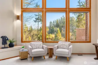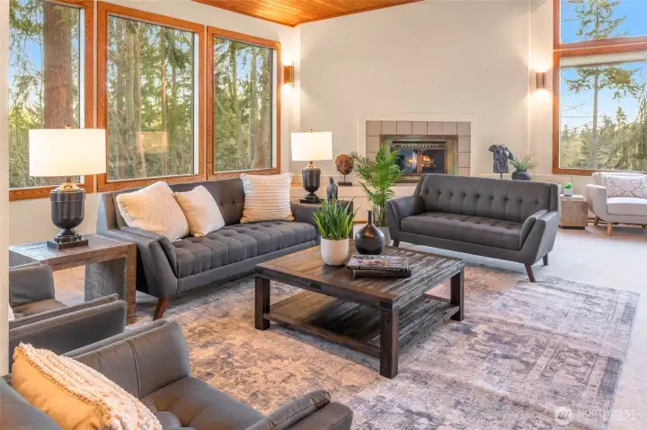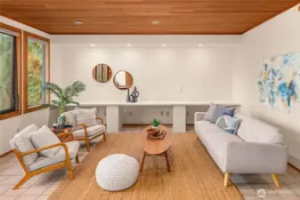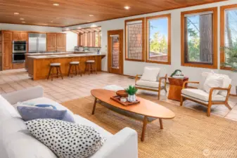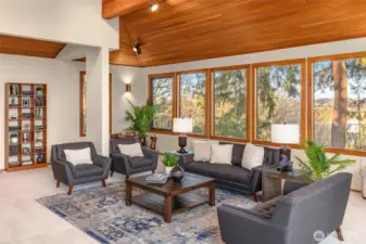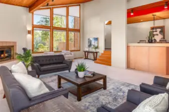 Designed for light, rooted in nature and touched by views of Lake Washington and Mt. Rainier. A true Northwest Contemporary, thoughtfully designed to bring the outdoors in and capture ever-changing natural light. Well-built and beautifully maintained, this home reflects the warmth and character of its surroundings. The main level showcases vaulted cedar-lined ceilings and a dramatic living room with lake views, creating a warm and inviting gathering space. The dining area connects seamlessly to the kitchen and expansive family room, designed for everyday living with built-in desks and effortless flow to oversized decks—perfect for entertaining or relaxing among greenery and filtered views. Also on the main level: a powder room, utility room, and two bedrooms with charming lofted bonus spaces, sharing a full hall bath. Upstairs, the vaulted primary suite offers a private retreat with an en suite bath, a loft-office, and large windows framing Mt. Rainier. The lower level expands functionality with 4th bedroom, ¾ bath, recreation room, sauna, and substantial storage. A spacious 3-car garage adds everyday convenience. Ideally located mid-island near Ellis Pond, the library, trails, and parks—this is a wonderful opportunity to experience Pacific Northwest living.