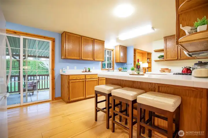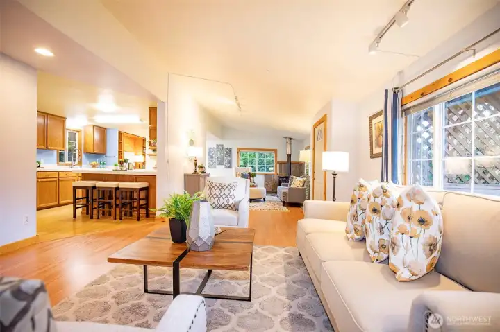 Tucked away on a quiet street in the heart of Fall City, this well-maintained home offers comfort, functionality, and everyday ease, complete with a covered front porch, perfect for slow mornings or winding down in the evening. Inside, the spacious living room features a cozy gas fireplace and flows naturally into the dining area, creating a welcoming layout for both daily living and entertaining. A built-in office nook adds a practical workspace for remote work or staying organized. The kitchen stands out with its generous size, gas stove, and abundant cabinet and counter space, offering plenty of room to cook, prep, and gather. The primary bedroom includes a private full bath with heated floors, while the second bedroom is conveniently located near a three-quarter bath. Step outside to enjoy the covered back patio and fully fenced backyard, offering privacy, garden space, mountain views, and two sizable storage sheds. The property is surrounded by established landscaping with vibrant flowers and mature shrubs that bring seasonal color and attract local birds. Additional features include a tankless water heater for efficiency and ample driveway parking with RV space and hookups. Ideally located just minutes from shopping, dining, parks, and trails, this home blends peaceful living with everyday convenience. Welcome home!