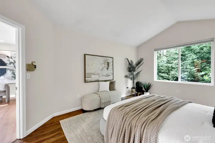Private primary bedroom overlooking patio below
