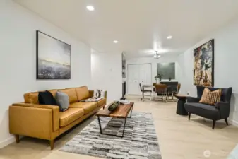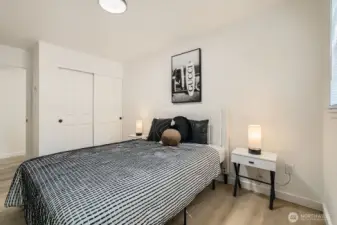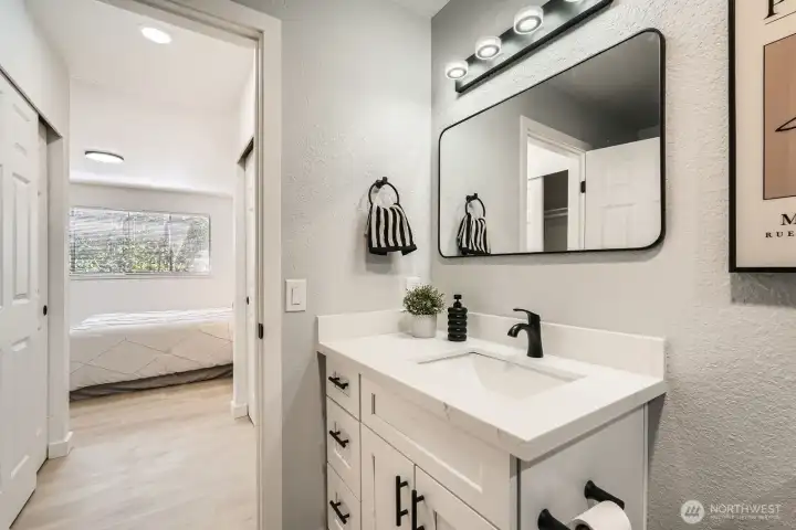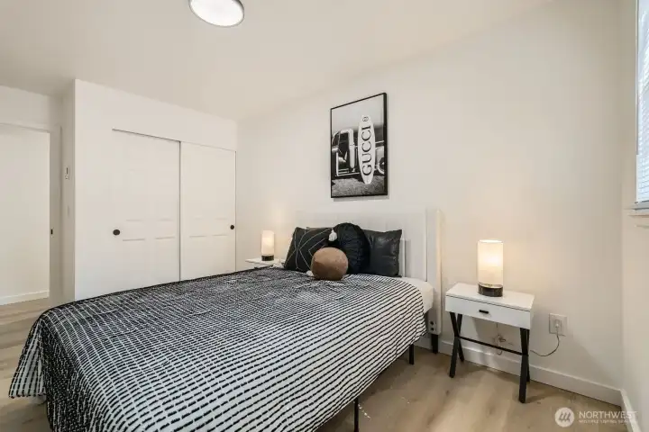 Fully Renovated Corner Unit. This stunning ground-floor corner unit has been upgraded from floor to ceiling with every detail thoughtfully curated. The modern kitchen stuns with matte black flat-panel cabinets, quartz countertops, and stainless appliances, all overlooking a private courtyard with a tranquil fountain, your new favorite spot for morning coffee or evening unwinding. The spacious layout features a wet bar, cozy wood fireplace accent wall, and a versatile bonus space perfect for a home office, gym, or creative studio. The primary suite offers dual closets and a spa-inspired bath with Tulum-style tile and frameless glass shower. Waterproof LVP flooring, new doors, trim, and designer lighting complete the picture. Dedicated parking, no rental cap, walking distance to Light Rail, and minutes to I-5, shopping, and dining. Come see it, you won't want to leave.