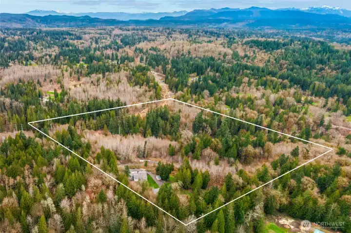 Welcome to your private sanctuary on nearly forty acres of pristine Duvall acreage with exceptional potential for future development. This stunning 2019 built home features five bedrooms, three and a half bathrooms, and dual primary suites, one on the main floor and one on the upper level, offering flexibility for any lifestyle. Surrounded by towering evergreens and mature trees, this 3,190 square foot home delivers authentic Pacific Northwest rural living while remaining conveniently close to downtown Duvall and all the Eastside has to offer. The open concept main floor showcases quality finishes with abundant natural light flowing throughout. A chef's kitchen with white shaker cabinetry, quartz countertops, herringbone tile backsplash, and stainless steel appliances seamlessly connects to the spacious great room featuring a shiplap gas fireplace with warm wood mantle. Step outside to the stunning covered patio with wood-planked ceiling and ceiling fan, perfect for year-round entertaining and outdoor living. Main floor also includes a dedicated home office with built-in cabinetry. Upstairs offers generous open flex space easily adapted to recreation, office, or playroom needs. The two-story shop features garage space below and a finished flex room with projection screen above. Additional storage shed completes the property. This rare offering masterfully combines newer construction, private acreage, quality finishes, and unmatched proximity to town and regional amenities.