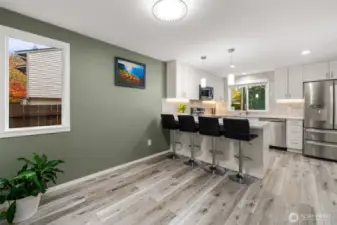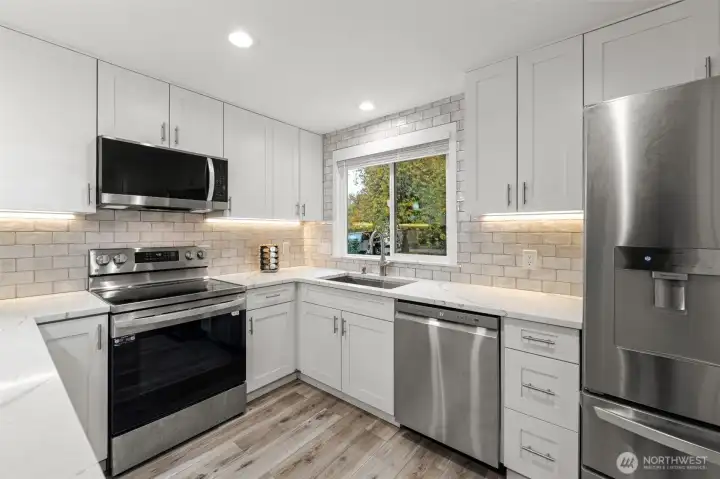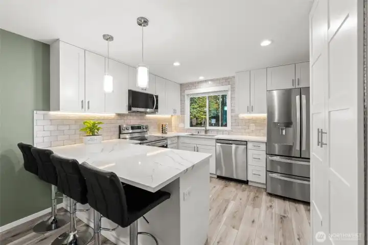 Exclusive chance to own this exquisitely remodeled residence in Kirkland. Crafted w/ enduring quality & design, this home features SS appliances, tall soft-close cabinetry, premium 12 mil LVP flooring, & a Heat&Glo gas FP framed in elegant stone, providing warmth even during outages. Upstairs, a bright staircase w/ skylight, leads to a refined primary suite & two add. bedrooms, all w/ custom-built closets, plus spa-inspired baths fully tiled w/ rain showerheads & a third bedroom showcasing an absolutely stunning accent wall. Flat, fully fenced backyard opens to a serene greenbelt, offering privacy & tranquil PNW sounds. Freshly painted exterior, minutes to Totem Lake Village, parks, major employers, I-405, & within the highly regarded LWSD! ... This home is platted as a single-family residence and conveyed as fee simple ownership, meaning the owner holds full ownership of both the home and the underlying land, unlike many townhome properties where the land is held in common interest. ... The remodel was completed in 2024 with all required permits pulled and approved. The home has been pre-inspected, please refer to the property website for additional information and a full list of improvements.