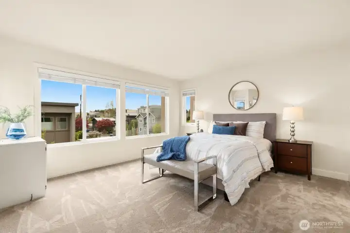 This contemporary townhome is crowned with a stunning rooftop deck, offering breathtaking, panoramic view of Lake Washington, the Cascade Mountains, and twinkling Bellevue skyline– your own private oasis above the city.