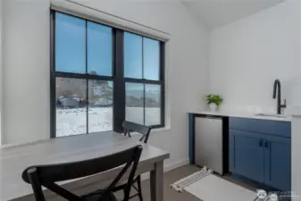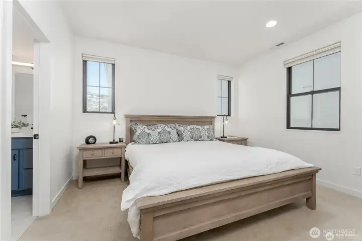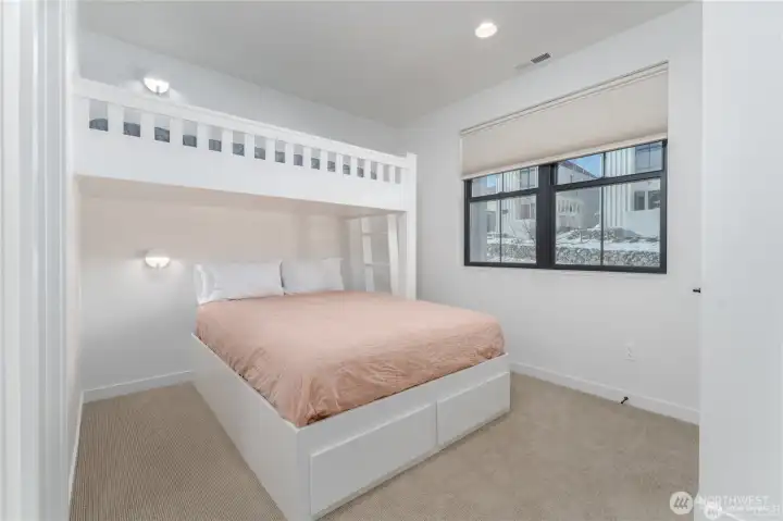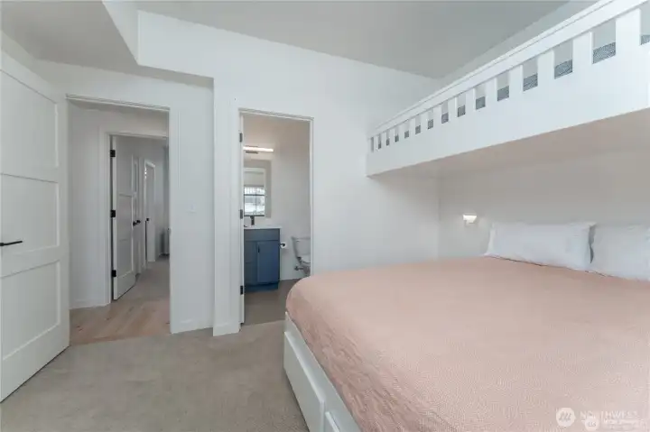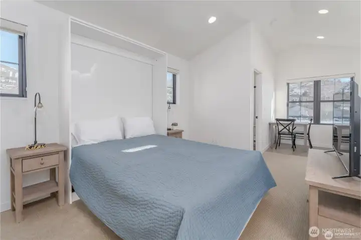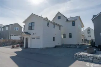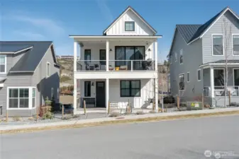 Like-new and impeccably maintained, this 2-bed, 2.5-bath home with a Carriage House comfortably sleeps seven! The light-filled main home offers 1,092 sq. ft. of stylish living with two spacious ensuite bedrooms, a pocket office, vaulted great room with gas fireplace, and 366 sq. ft. of covered deck space for year-round enjoyment. The Carriage House adds 286 sq. ft. of flexible living featuring a bonus room with queen Murphy bed, kitchenette, and ¾ bath — perfect for guests or short-term rental income. Enjoy abundant parking plus a 384 sq. ft. garage providing excellent storage or additional flex space. With nearly 1,400 sq. ft. of total living area, this fully furnished turnkey property offers exceptional value and versatility. Located in The Lookout, a premier community with waterfront access, sandy beach, marina, parks, pools, playgrounds, and on-site management & hospitality — a truly unique opportunity!