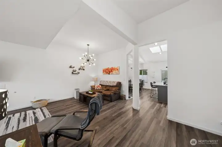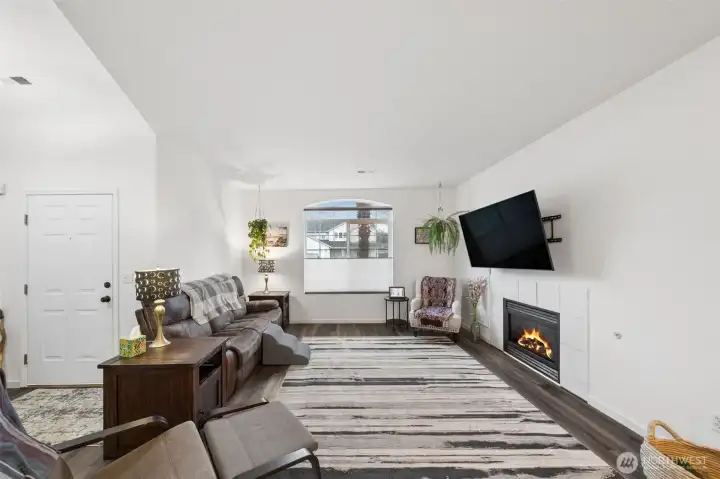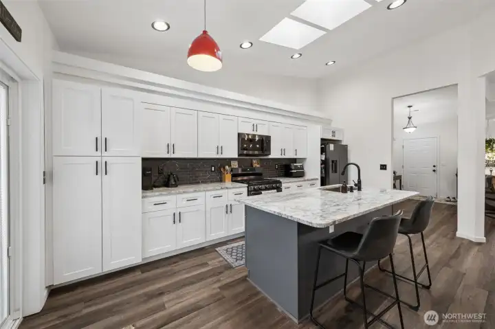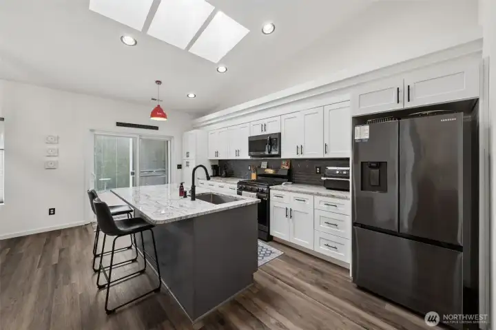 Adorable Puyallup Valley rambler in the desirable SummerView Estates community, located within the sought-after Sumner School District and featuring private trail access to the Puyallup River! This beautifully remodeled home offers an open-concept floor plan with soaring vaulted ceilings and timeless finishes throughout. The spacious living room with a cozy gas log fireplace flows seamlessly into the light-filled kitchen and dining area. The stunning kitchen was fully updated in 2022 with new quartz countertops, white cabinetry, SS appliances, LVP flooring, and a center island with breakfast nook—perfect for everyday living and entertaining + a wet bar off the dining area! The inviting primary suite features a walk-in closet with California Closets and a private ensuite bath with double sinks. 2 additional guest bedrooms and bath! Additional updates include new interior paint (2022) and a brand-new 30-year roof installed in October 2025, offering peace of mind for years to come. Step outside to your own private retreat—fully fenced and beautifully landscaped with mature arborvitae for added privacy. Enjoy outdoor living on the luxurious stamped concrete patio, plus paved RV parking, a storage shed, and plenty of space for all your needs. Residents also enjoy access to a gated neighborhood park and scenic river trail. A truly wonderful and welcoming community to call home!