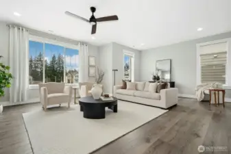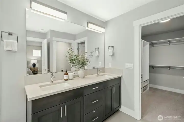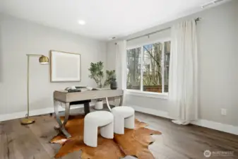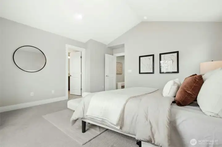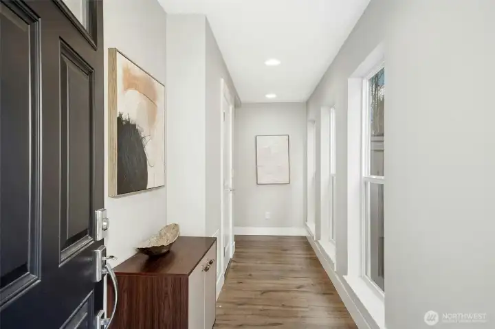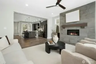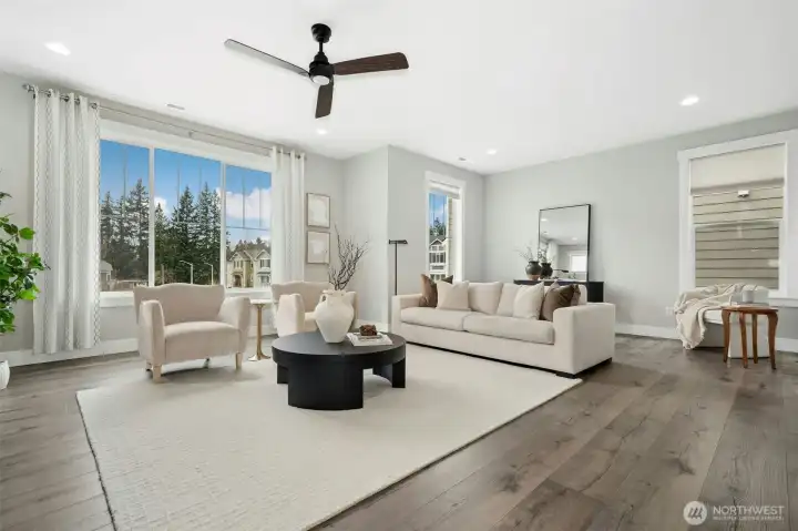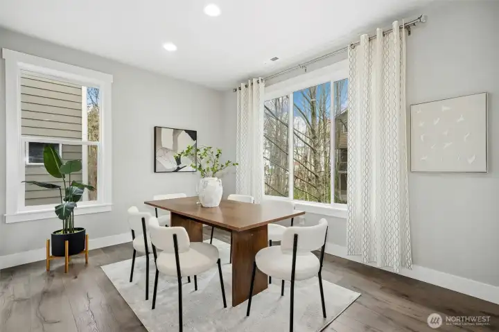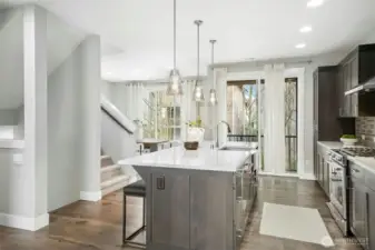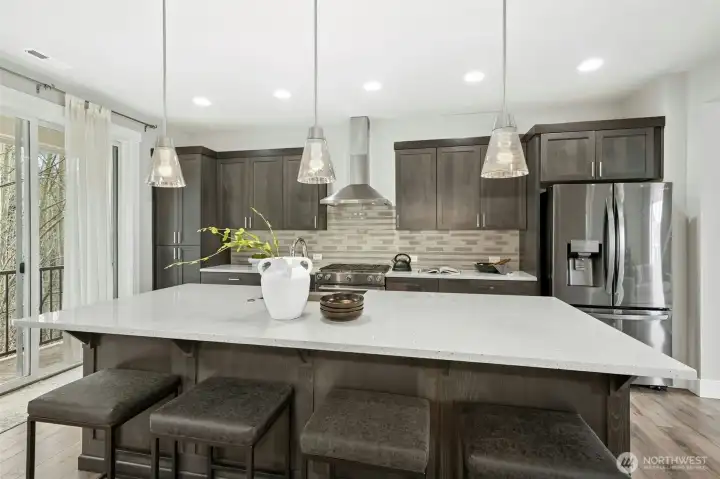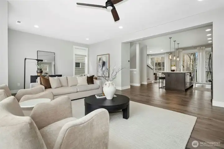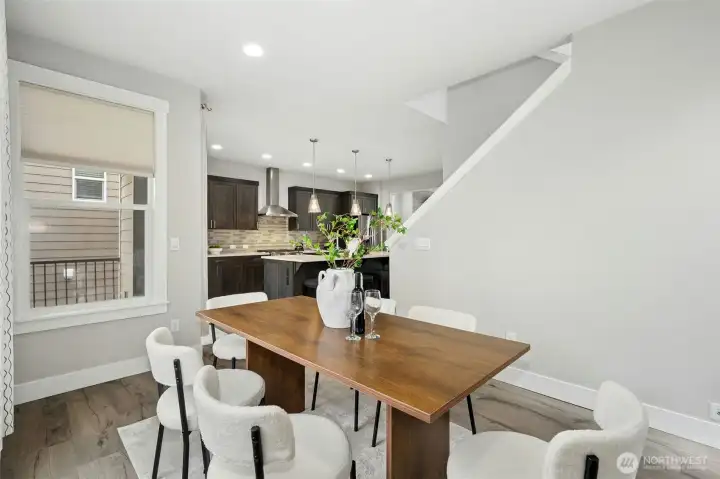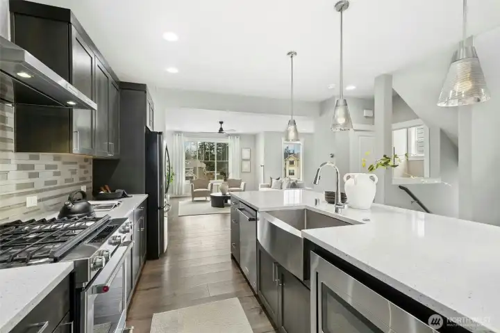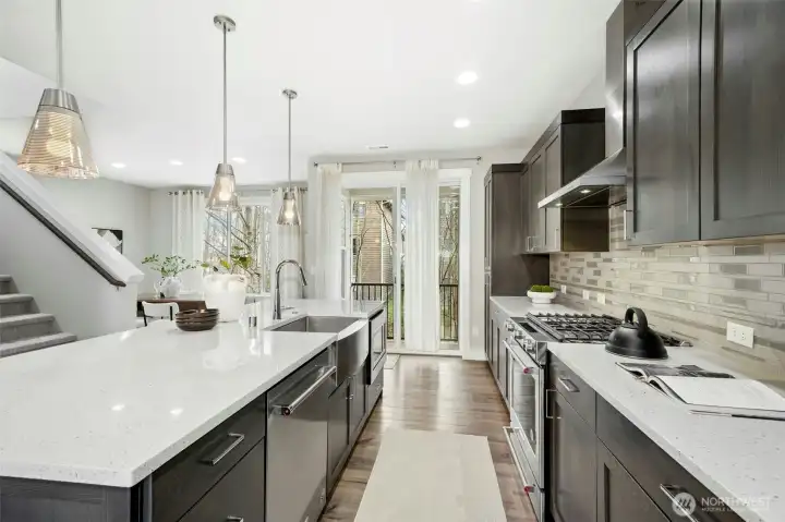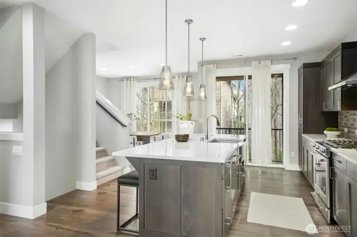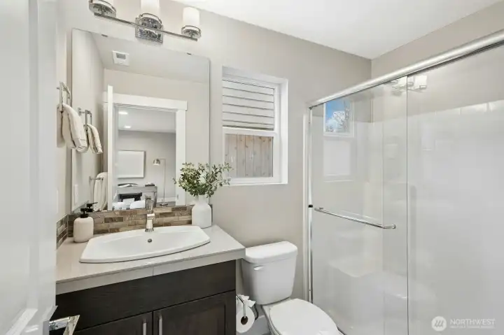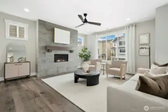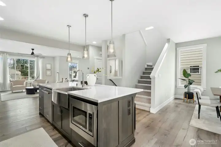 Welcome to Creekside Grove—your private oasis in this vibrant community! This impeccably crafted, perfectly sized detached townhome blends great room elegance with exceptional finishes, offering effortless modern living. Entry level delights with a versatile flex space (ideal office/guest space)+ 3/4 bath—perfect for multi-gen living. Ascend to the main level's chef-inspired heart: a stunning kitchen boasting slab quartz counters, farmhouse-style stainless sink, soft-close cabinets w/ base pull-outs, and a motion-activated faucet for seamless prep. Flow into the huge living room anchored by a gas fireplace clad in full-height designer tile, all under rich trim detailing + engineered flooring throughout lower/main levels. Dining area spills onto a covered deck—your al fresco entertaining hub w/ a lush, treed backdrop! Retreat to the luxurious primary suite w/ spa-like bath featuring dual vanities, soaking tub + frameless shower. Two additional beds + full bath upstairs complete the picture. New Air conditioning, too. Just in time for Spring! Prime location. Just minutes to I-5 & I-405, employment hubs, parks + shopping. Pre-inspected for your piece of mind.