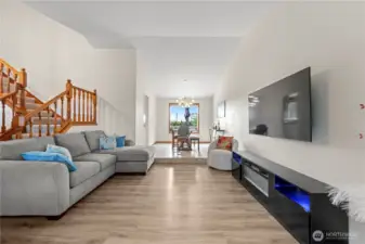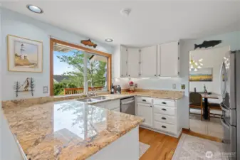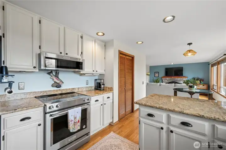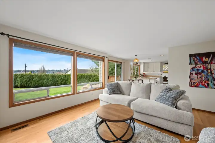 Lake views and community beach access in one of Lake Stevens most sought-after locations! This beautifully updated 4-bedroom home is packed with thoughtful upgrades throughout. The great room impresses with vaulted ceilings and updated LVP floors, while the kitchen features granite counters, stainless steel appliances, and oversized windows framing stunning lake views. The living room showcases real hardwood floors and a wood-burning fireplace that opens to a large deck and level, fully fenced backyard. Upstairs, the primary suite offers full panoramic lake views from a private Trex balcony. The 5-piece bath is a true retreat with skylights, custom tilework, a jetted soaking tub, and glass shower. Steps to community beach access, Lundeen Park, and Lake Stevens High School. Fully pre-inspected and move-in ready. Don't miss this one!