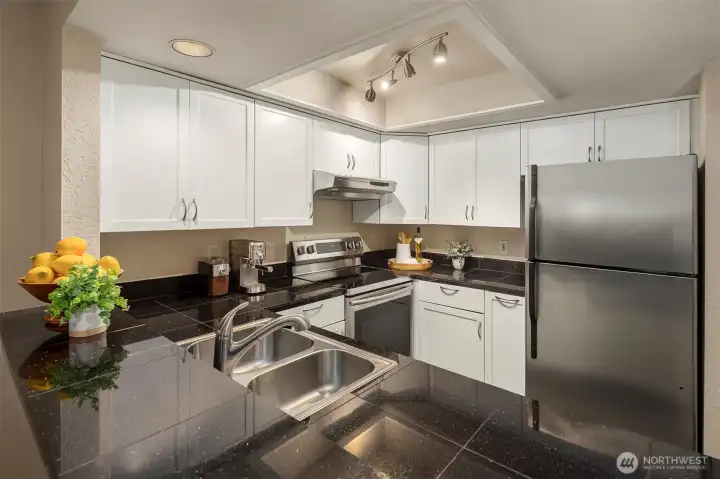 Come and get it! Beautifully maintained 2-bedroom, 2-bath condo in desirable Compton Court, in Bellevue. This light-filled, south-facing home features vaulted ceilings and a bright, open living space. The kitchen is beautifully updated with granite tile counters, new stainless steel sink and appliances. New wide plank laminate flooring throughout. Sharp! The Primary Suite is complete with a lovely 3/4 bath and a large walk-in closet! Situated on a quiet cul-de-sac less than a block from Odle Middle School and within one of the most highly rated school districts in our region - Bellevue Schools. This home includes two covered parking spaces (rare) #7 and #8, that are closely situated to the home - right out front, in fact. The parking lot was just newly paved and fully fenced and is beautifully refreshed. All the windows are updated with vinyl sash, offering the highest level of insulation available. This home boasts solid, quality construction with timeless materials. Exceptionally well cared for and move-in ready. East facing front door! Convenient location close to Lake Hills Native Growth Protected area with secluded forested trails around Larsen Lake. Right next to the Bellevue Aquatic Center and includes access to the tennis courts, baseball/football fields and running track. Excellent proximity to the Kelsey Creek Park and Glendale Country Club! Plenty of shopping, dining, and everyday amenities quite nearby!