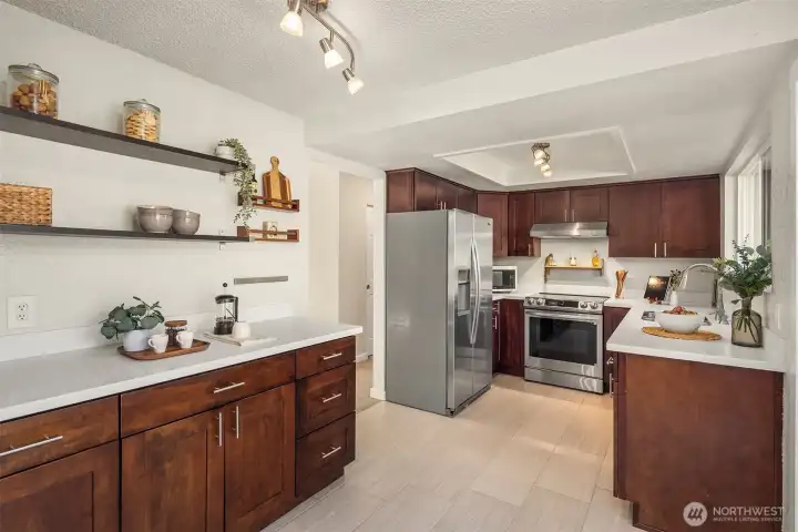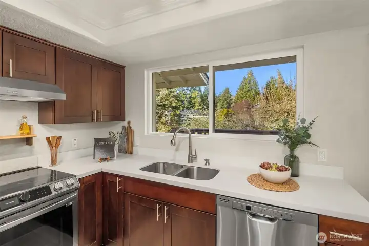 North Rose Hill retreat with room to roam! Charming home on a level, fully fenced lot with garden space and fruit trees. Updated kitchen features quartz countertops and stainless appliances. Sliding glass doors open to a generous deck, perfect for summer grilling or al fresco dining. The sunlit family room with vaulted ceiling and wood burning fireplace offers space to relax or entertain. Primary bedroom with ensuite bath overlooks the tranquil rear yard. Two additional bedrooms and an updated bath round out the upper level. Lower level recreation room is the ideal play or media space with adjacent half bath and utility room. Expansive rear yard offers a little something for everyone with raised garden beds, fire pit, hot tub and storage shed. New roof installed in 2023! Highly rated Lake Washington Schools. Great commuter location with easy access to freeways, transit and tech employers. Welcome home!