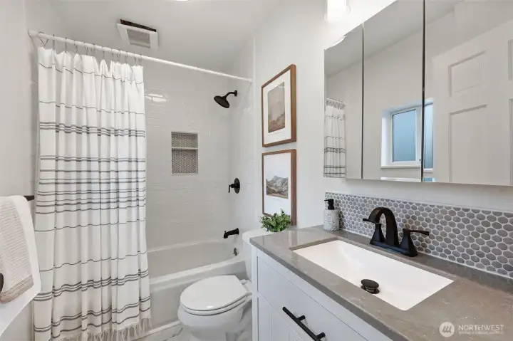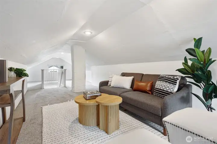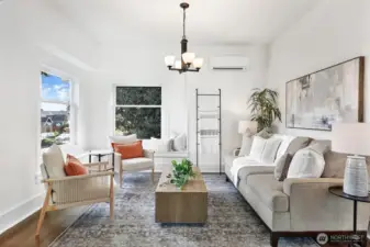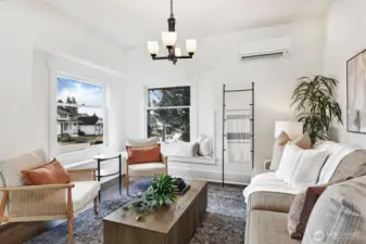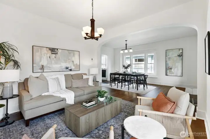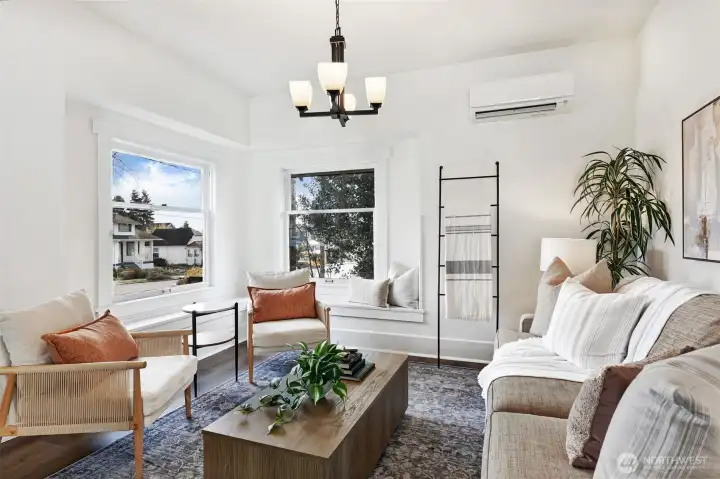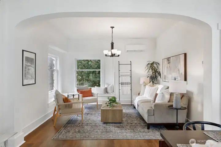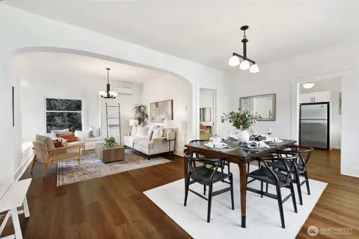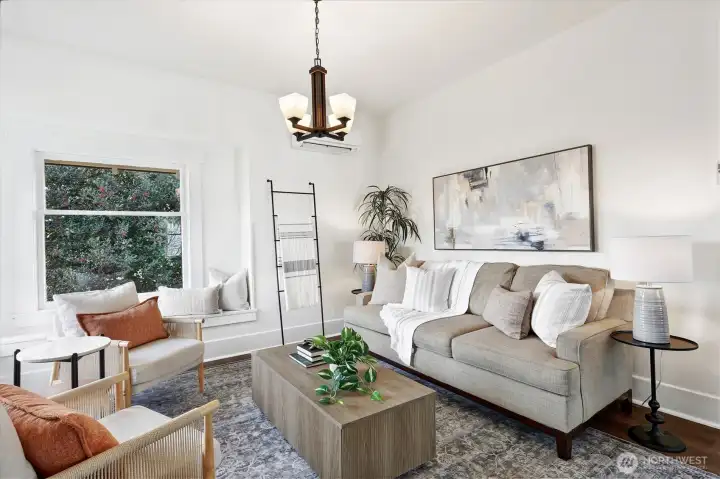 Classic Ballard craftsman in the heart of Loyal Heights just up from Mable coffee shop. Well landscaped front yard. Classic front porch with glass-paned front door. Historic charm blended with modern updates welcomes you in with high ceilings and a sun-filled dining room and living room, complete with built-in window seats. Spacious and newly remodeled kitchen boasts a gas range, gorgeous countertops and cabinetry. Renovated bathroom shows tasteful updates including tub-to-ceiling subway tile. Primary bedroom has vintage multi-paned windows along with an adjacent dressing room (or office?). Second bedroom is good sized. Upstairs, enjoy an open flex space perfect for a rec room, guest room, or home office. Main floor has mini-split unit for both heating and cooling. Exterior staircase leads you down from the back door to the exterior entrance of the lower two bed, 1 bath mother-in-law apartment with its own full kitchen and living room. Ideal for multi-generational living, work from home, or for rental income. Fully fenced back yard. Alley access with level gravel parking for 4 cars also has great DADU potential. Leave your car at home and walk to neighborhood favorites like Larson's Bakery and Soprano's Pizza to the north, or head south to everything downtown Ballard has to offer.