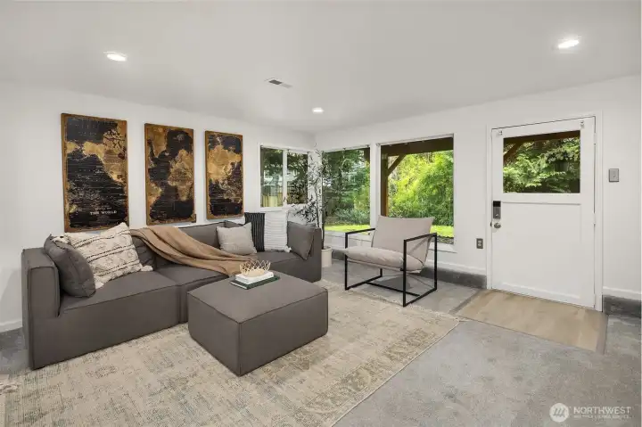 Tucked behind a private gated drive, this serene estate presents a rare blend of privacy, natural beauty, development potential, and everyday convenience—just a short walk to top schools & parks. Soaring vaulted ceilings wrapped in warm natural wood create a striking architectural presence, while expansive windows fill the home with abundant natural light. The timeless permitted remodel features high-end finishes throughout, including a chef’s kitchen with bold contrasting cabinetry, premium quartz countertops & a Wolf gas range. The interior was tastefully updated in 2022: new flooring, plush carpeting, and fresh paint, high-efficiency furnace & AC, Lutron smart switches and remote climate control. Designer brass fixtures and pendant lighting create a warm, inviting atmosphere. Brand-new composite decking and glass railing are designed for year-round entertaining. The lower level features a beautifully appointed 2b/1ba ADU with private entrance and full kitchen, ideal for multigenerational living or supplemental rental income. The generous yard presents potential to develop an additional residence exceeding 4,500 SF. Thoughtfully equipped with an EV charging station and a backup generator, the property also offers ample space for RV parking. Surrounded by lush greenery, this home embodies both peaceful seclusion and exceptional versatility—an opportunity to live, expand, and invest in one remarkable setting.