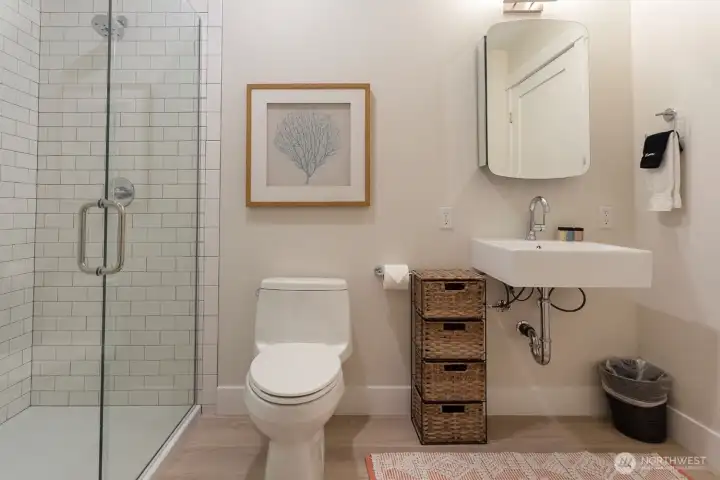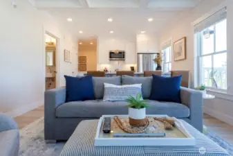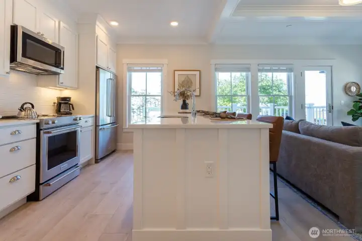 Experience the bright, airy ambiance of "At Last," a peaceful North Market Street Loft where abundant natural light meets warm, beachy tones and décor. Perfectly situated in Seabrook’s vibrant Town Center, you are just steps from all of Seabrook’s restaurants and retail spaces. The open-concept kitchen and living spaces are lined with an almost continuous wall of West-facing windows, offering beautiful views framed by distant Spruce trees and vibrant Alder trees and greenery across the street. Just off the living room, a deck offers an ideal spot to relax. The primary bedroom features a comfortable king bed. The Jack-and-Jill ensuite bathroom features a walk-in shower and offers convenient access from the living room. The North Market Street Lofts have a private elevator and a rooftop patio to enjoy. The condo is also conveniently located a short walk from the beach—perfect for an afternoon of beachcombing, reading, or strolling in the surf.