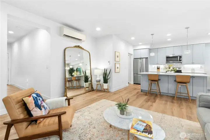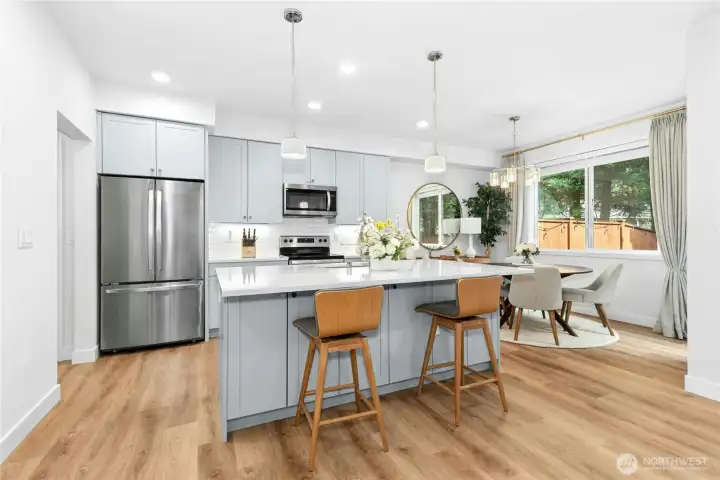 Immaculate luxury end-unit townhome with lots of privacy in the best location in the complex. Better than new, feels like a 2-story home with minimum maintenance required, low HOA dues. Features include designer finishes throughout, solid slab quartz countertops, wood wrapped and painted millwork, mini split air conditioning, great room with cozy electric fireplace, double-doors and walk-in closet for primary bedroom, heated floors in primary bath, utility room with sink and generous counter space with cabinets, and more! Dining room back door leads to patio and good sized fully-fenced level yard with new sod. 2-car garage plus space for 3 cars in driveway. All appliances are included. Great location close to Martha Lake, Mill Creek Town Center, Alderwood Mall, Costco, shops, restaurants, etc. Easy access to I-5 and 405 freeways and Park-N-Ride. Welcome Home!