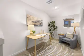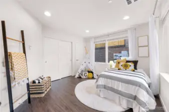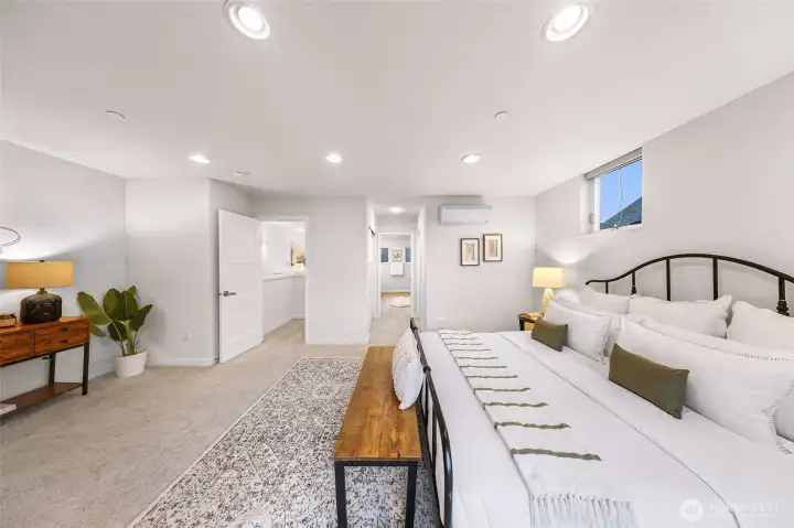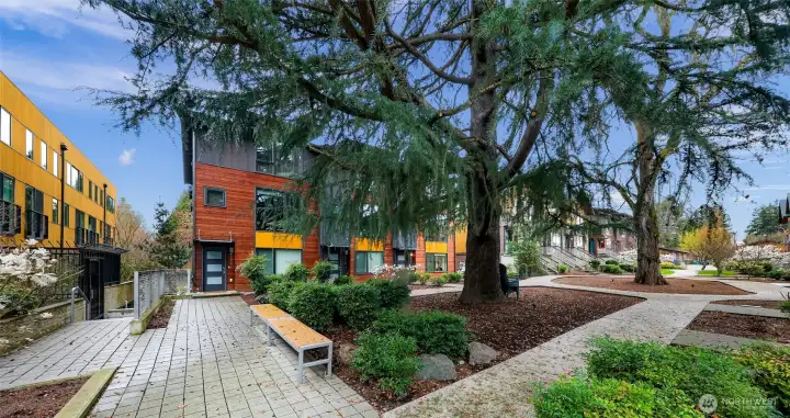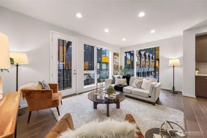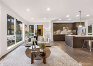 Modern and light-filled, this thoughtfully designed townhome offers airy 9-foot ceilings, floor-to-ceiling windows, and a layout that feels both spacious and inviting. The lower level features two generous bedrooms (or use one as a flex space/media room), a ¾ bath, in-unit washer and dryer, and direct access to a private patio garden. At the heart of the home, the open-concept main level is made for everyday living and easy entertaining, with a striking 12-foot quartz island, stainless steel appliances, and a 5-burner gas range. The living area, with engineered wood floors, opens to a large balcony. Upstairs, the primary suite feels like a true retreat, with a loft for a fitness area or home office, plus a beautifully appointed bath with double sinks, abundant storage, a soaking tub, and a separate frameless-glass shower with rain showerhead. Wired for ethernet with high-speed internet available, the home also includes one dedicated secure garage parking space with elevator access and just across from the stairs.Tucked along the interior courtyard of this distinctive community, the location offers nearby: Bryant Corner Cafe, Ridge Pizza, Top Pot, Starbucks, Grand Central Bakery, and the Northeast Seattle library. Top rated schools include Bryant Elementary, Eckstein Middle School, and Roosevelt High, Green Lake, University Village, Magnuson Park are close at hand. Bus Lines and Light rail, are minutes away. Welcome Home!