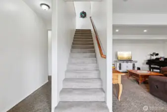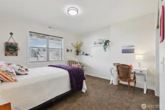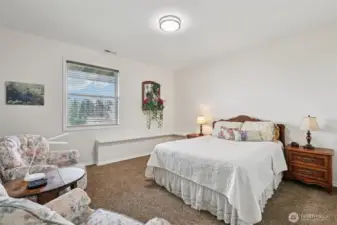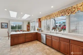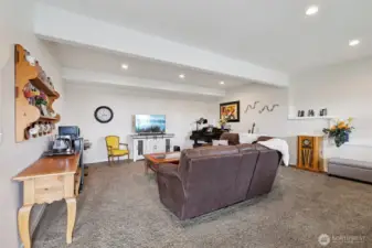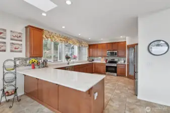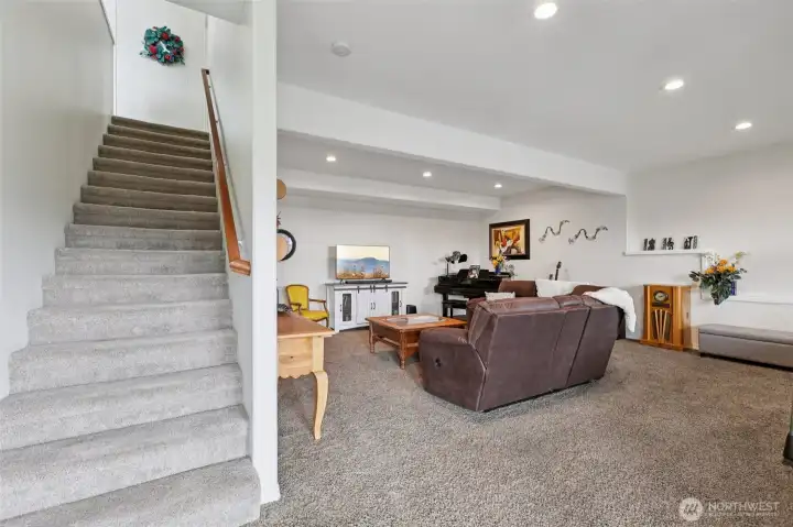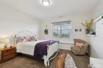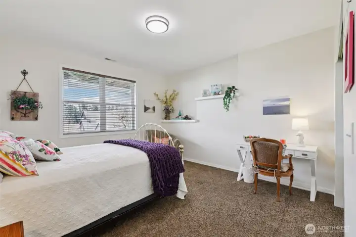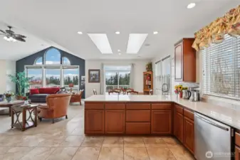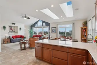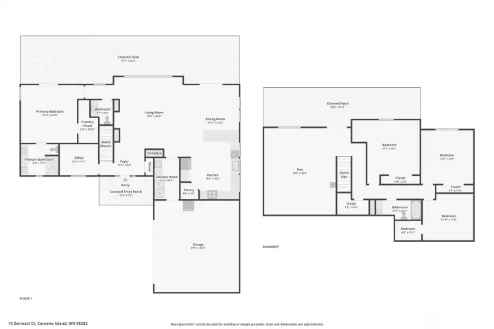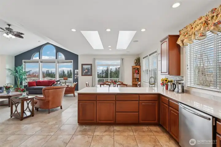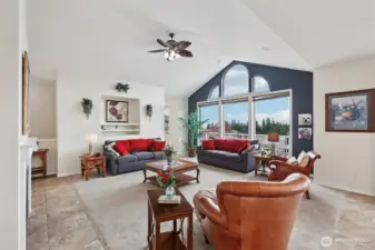 Perched in the highly sought after Cavalero Hills community, this 3,200 sq ft daylight rambler offers sweeping views of the Sound and Cascade Mountains, creating a serene backdrop for everyday living. Designed to capture natural light, the spacious living room features a dramatic wall of windows and a cozy gas fireplace—perfect for relaxing while taking in the scenery. The gourmet kitchen is a true centerpiece, boasting rich cherry cabinetry, expansive quartz countertops, and abundant prep space, seamlessly flowing into the adjoining dining area—perfect for entertaining or casual meals. The main floor primary suite offers convenience and comfort, complete with a private slider opening to the view deck, where you can enjoy morning coffee or evening sunsets. A dedicated office provides flexibility for remote work or creative pursuits. Downstairs, a generously sized bonus room offers endless possibilities. Media room, guest quarters, or recreation space. Situated on a generous sized lot with a rolling lawn and mature fruit trees. Ideally located near the community trailhead and beach access, this home combines peaceful living with easy access to nature—an exceptional opportunity in a coveted neighborhood.