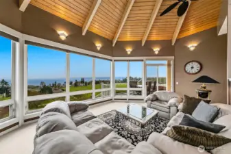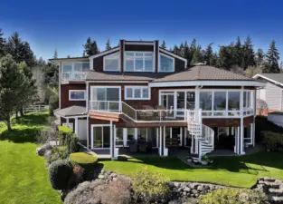 Set on a private 0.74± acre parcel in Clinton, this expansive home offers over 4,100 square feet of versatile living space with sweeping views of the Sound, mountains, and surrounding territorial landscape. Thoughtfully designed with a tri-level layout, the home provides multiple living areas, creating flexibility for a variety of lifestyles. The main living spaces are filled with natural light and anchored by two fireplaces, offering warmth and character throughout. Generous room sizes, bonus spaces, and a fully finished lower level create opportunities for extended living, guest quarters, or potential income, with short-term rental allowed. Outdoor living is just as inviting, with a gated entry, partially fenced yard, garden space, fruit trees, and terraced grounds. Multiple decks and patios provide ideal spaces to take in the views and enjoy the peaceful setting. Additional features include a heat pump with air conditioning, attached garage, and outbuildings for storage or hobbies. Conveniently located just minutes from the Clinton ferry, this property offers space, flexibility, and the best of Whidbey Island living.