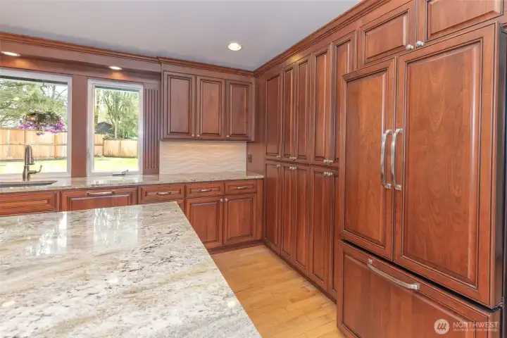 Kitchen is a central feature of the home’s layout, offering abundant counter space and ample storage. Refrigerator and dishwasher feature matching cabinet fronts for a seamless look. Recessed lighting and a built-in TV enhance functionality, and bar stools are included with the home.