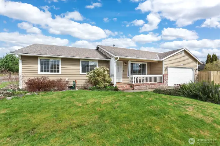 Enjoy Mt. Rainier views from this beautifully maintained, move-in ready 3-bedroom, 1.75-bath rambler home in desirable Berilla Estates. This light-filled residence features an open-concept kitchen and living area with vaulted ceilings and rich hardwood floors, creating an inviting and spacious atmosphere. The vaulted living and dining rooms are anchored by a shared see-thru gas fireplace insert, perfect for cozy gatherings and seamless entertaining. The well-appointed kitchen flows effortlessly into the main living space. The private primary suite offers a relaxing retreat with its own bath and a full wall of closets for ample storage. Two additional bedrooms provide flexibility for guests, work, or hobbies. Step outside to a large side yard with garden space and room for potential RV parking. The covered front porch with durable Trex-style decking adds charm and a welcoming outdoor space to enjoy year-round. Complete with a 2-car garage and located in a peaceful Enumclaw setting!
