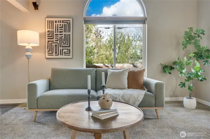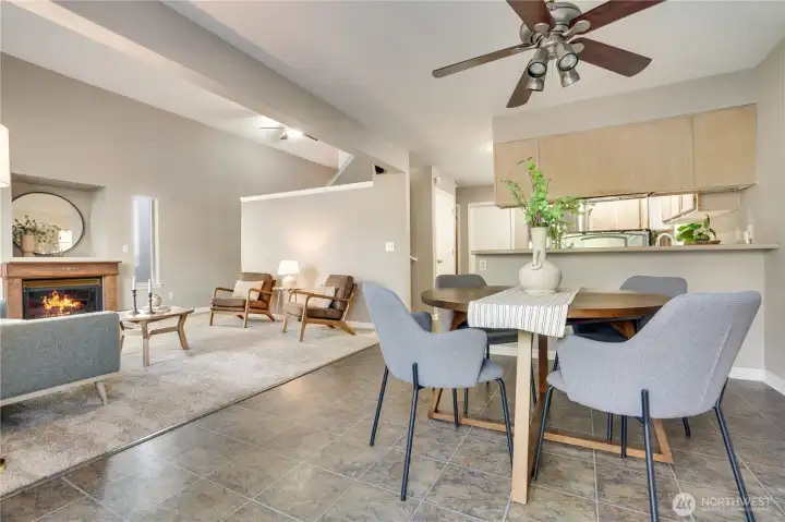 Vaulted Ceilings and beautiful windows bring in the greenery and natural light. Flow from the living room, to the dining and family area, to the kitchen!