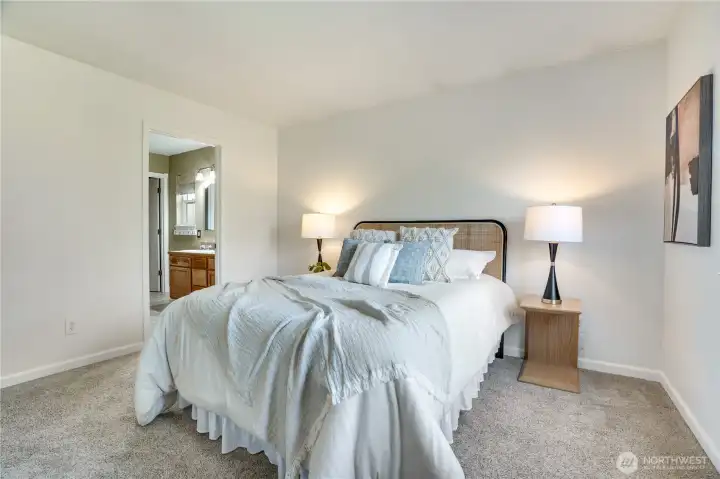 Freshly painted primary is roomy enough for your King bed and dressers.