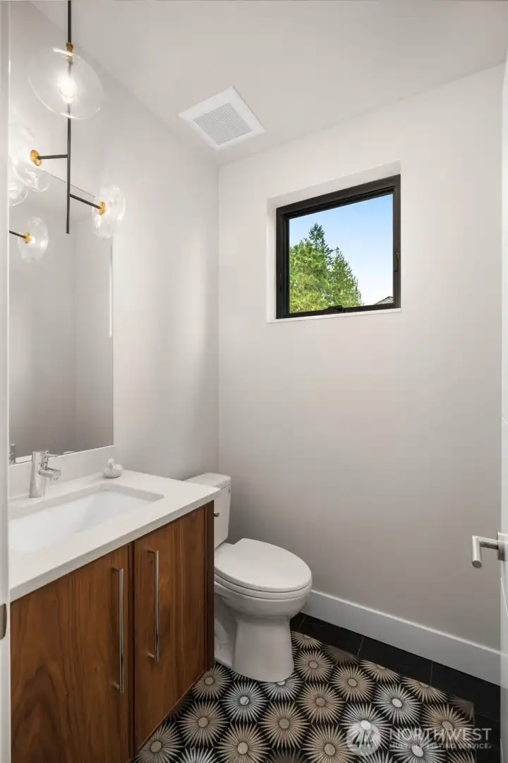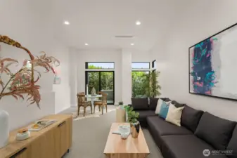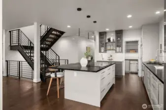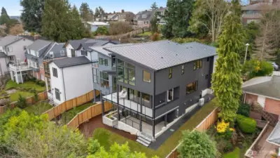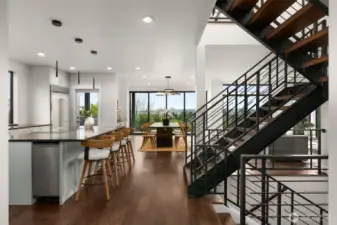 A truly rare, one-of-one architectural statement where engineering precision meets elevated design. Constructed with steel moment framing to eliminate structural barriers, the home achieves dramatic open spans, uninterrupted sight lines, and walls of black-framed fiberglass and clerestory windows that pour natural light into every space while maintaining refined privacy. Finished-in-place white oak hardwoods flow seamlessly throughout, creating warmth and continuity. The chef’s kitchen is both striking and impeccably appointed, featuring custom Belmont cabinetry with tailored pull-outs and integrated storage, stunning quartzite countertops, Thermador appliances, a Sub-Zero refrigerator, induction cooktop pre-plumbed for gas, discreet in-island ice maker, walk-in pantry with bev refrigeration, and infrastructure for a plumbed coffee system—designed for effortless daily living and elevated entertaining. Quartz surfaces and Grohe fixtures enrich each spa-inspired ensuite. The primary suite is a private sanctuary with a soaking tub positioned for views, bespoke tile, walk-in closet, and direct access to a covered rooftop deck with clear cedar ceiling, sweeping Mount Rainier vistas, and prewiring for heaters and media. Collapsible sliders open to a wraparound paver terrace pre-plumbed for a future outdoor kitchen. A fully soundproofed lower-level retreat, wine cellar infrastructure, EV-ready garage, and future-forward systems complete this exceptional expression of modern luxury