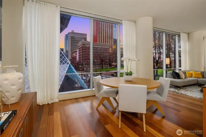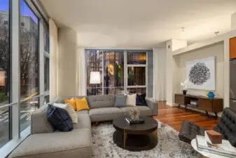 Floor to ceiling windows create a modern, bright feel in this downtown condo with expansive, open floor plan. Corner unit features sophisticated finishes including hardwood flooring + high ceilings. Dramatic loft-like living/dining area offers potential for refined entertainment. Chef’s kitchen boasts high-end Bosch stainless appliances, gas range, sleek cabinetry. Ensuite bath highlighted by dual-sink vanity. In-unit washer/dryer + guest powder room add convenience. Striking concrete/steel/glass building with Gold LEED certificate has been awarded for environmentally-conscious construction. Enjoy lifestyle amenities such as 24-hr. concierge, terrace, well-equipped gym, guest suites, parking. Highly walkable location in heart of everything.