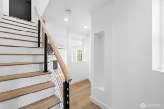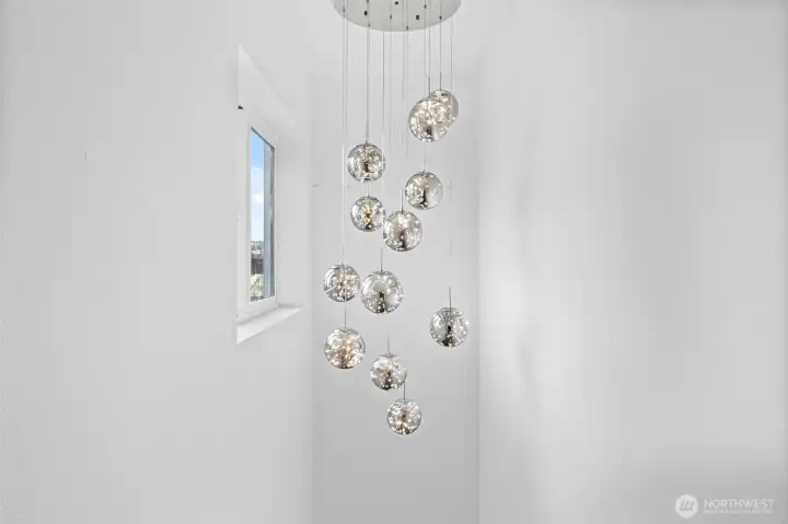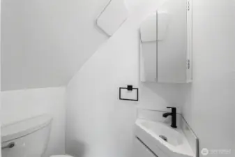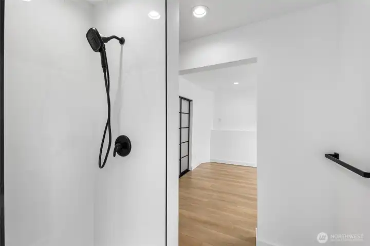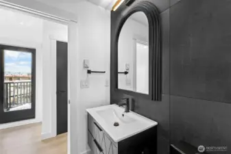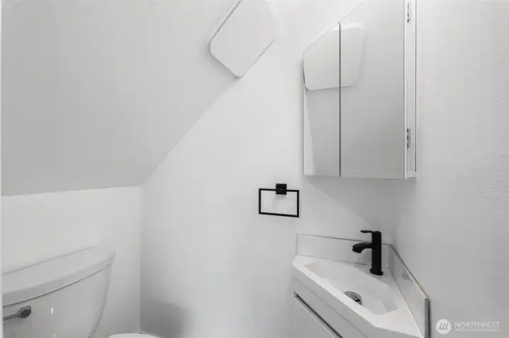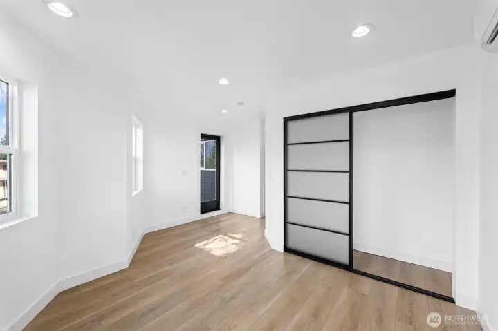 Fully remodeled 2 bed, 1.75 bath home in Seattle's Magnolia neighborhood featuring high end finishes throughout. The main living level offers an open kitchen/living area with glossy dark cabinetry, quartz countertops and backsplash, stainless steel appliances, black hardware accents, and a mini split system. Stunning multi globe pendant chandelier anchors the stairwell. Both bathrooms have been completely updated, one featuring dramatic floor to ceiling dark tile, black fixtures, and an arched mirror. Bedrooms include mini-split systems, ample natural light, and sleek frosted panel sliding closet doors. Additional highlights include LVP flooring throughout, cable rail staircase with wood handrail, a half bath on the lower level, and a private deck with territorial and city views. Modern exterior with dark lap siding and panel accent finishes the look.