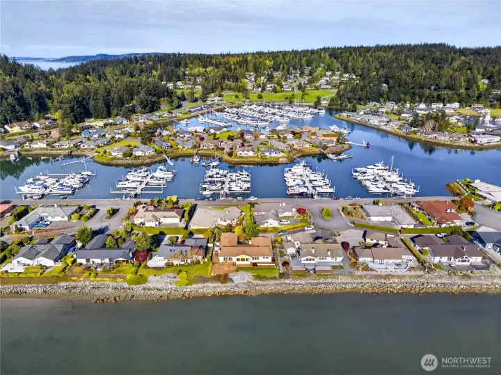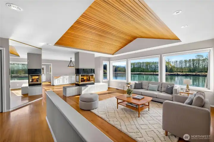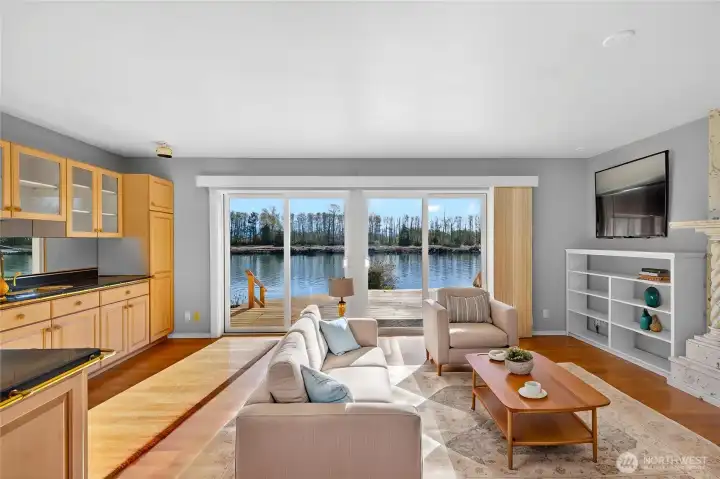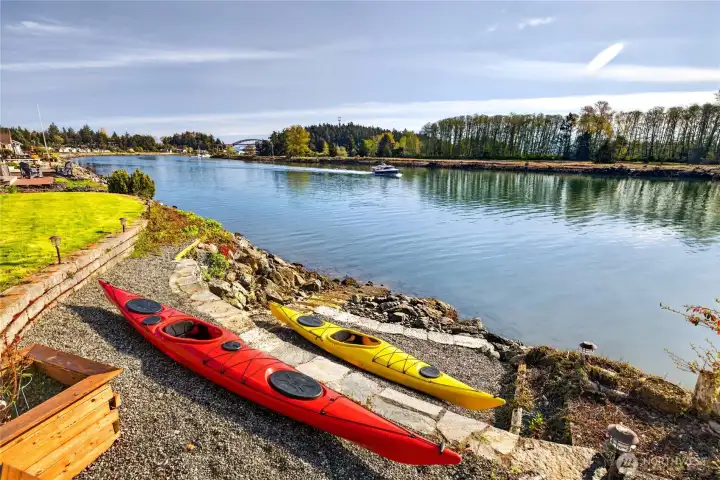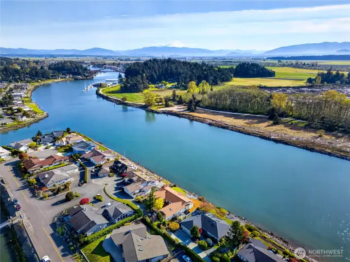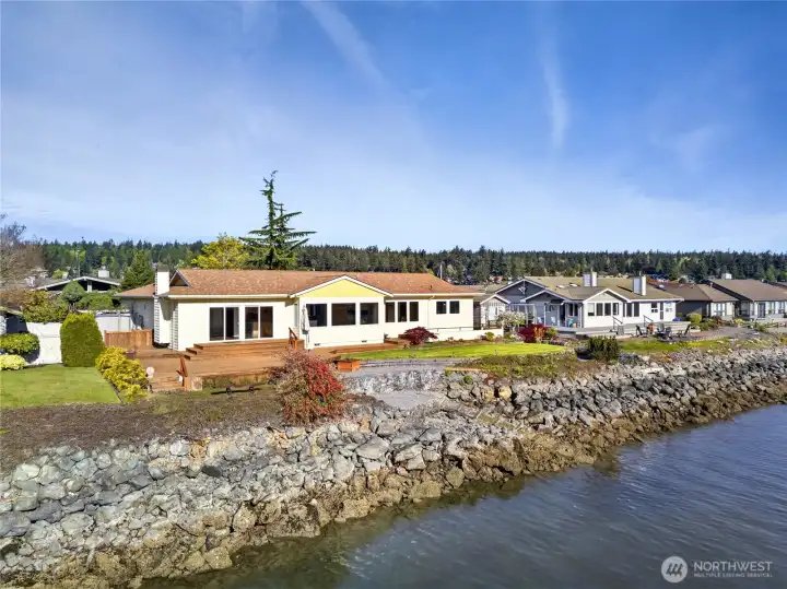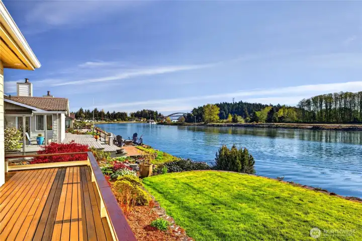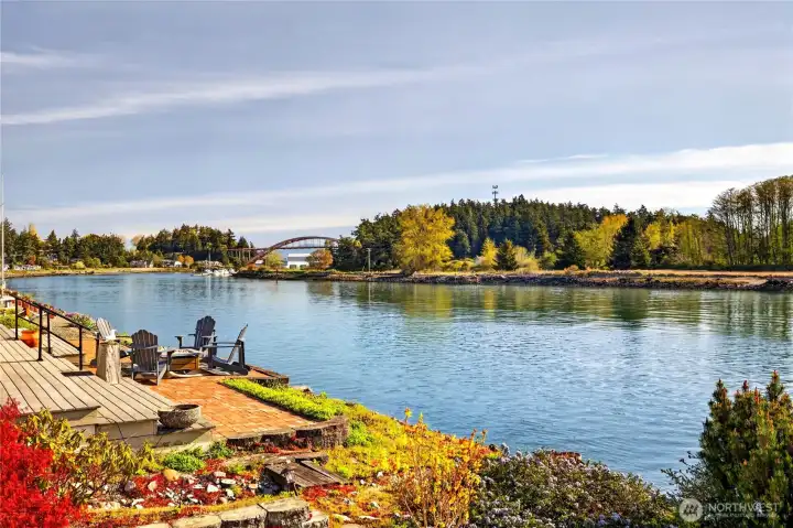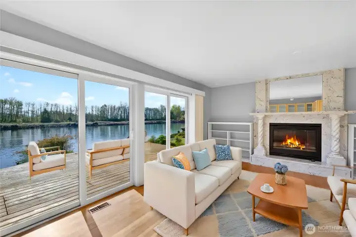 Experience true waterfront living in this beautifully positioned Shelter Bay home with direct access to the water and sweeping channel views. Step outside to your expansive deck and shoreline—perfect for kayaking, paddleboarding, or enjoying the calm scenery right from your backyard. Inside, large picture windows frame the water from the main living spaces, filling the home with natural light. The open layout flows effortlessly, highlighted by warm hardwood floors, a wood-accent ceiling, and a double-sided fireplace that creates a cozy focal point between the living and dining areas. The kitchen offers ample storage and workspace while staying connected to the main living areas and water views—ideal for everyday living or entertaining. Multiple sliding doors lead to the deck, creating seamless indoor-outdoor living. Enjoy sunset evenings on the spacious courtyard-style deck, featuring a tranquil pond and landscaped stream that enhance the peaceful setting. Located in a quiet waterfront community, this home offers a blend of tranquility, lifestyle, and convenience—minutes from the charming town of La Conner, yet feeling like a private retreat. For boating enthusiasts, you’re approximately 200 feet from the Shelter Bay marina and moorage—an exceptional opportunity for easy water access. Shelter Bay also offers favorable financing options for leased land properties. This is your chance to own a slice of waterfront living in the Pacific Northwest..**Leased Land**