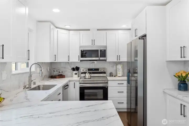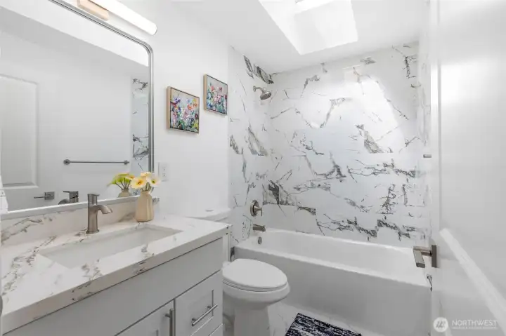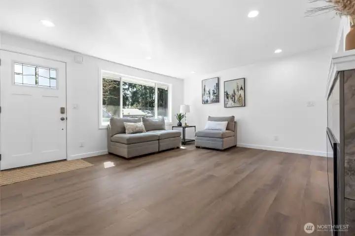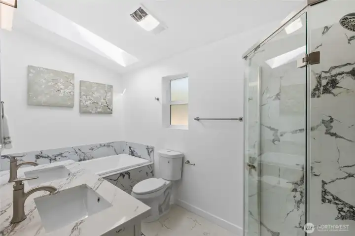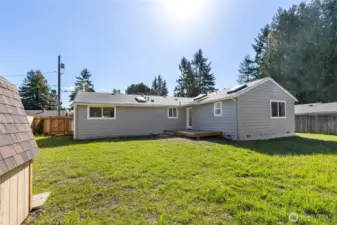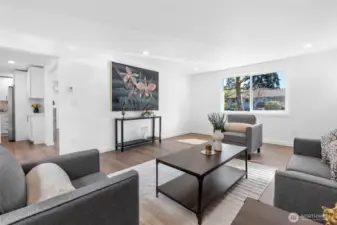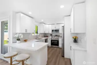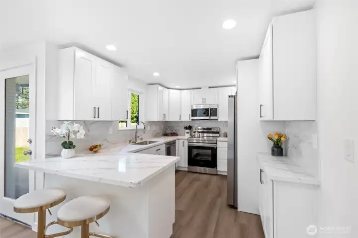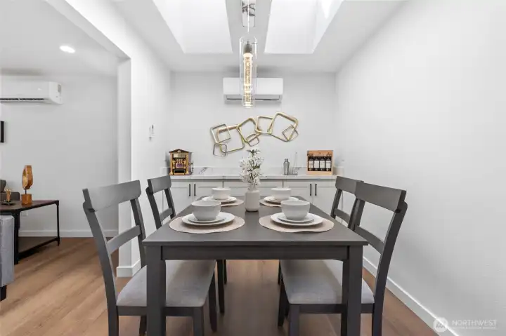This fully remodeled 1,668 sq ft single-story home in the Edmonds community is situated on a 7,405 sq ft lot and features skylights throughout, creating an inviting atmosphere with abundant natural light. The interior includes new paint, updated flooring, and a dining room with a built-in bar. The updated kitchen provides new countertops, cabinetry, and ample storage, while the bathrooms feature new vanities, hardware, and showers, including a skylight in the guest shower. The primary suite is equipped with a soaking tub, a separate shower, and twin sinks. Extensive infrastructure updates include a new house drain and supply water piping, a ductless HP-mini split system, and a fully protected electrical rough-in with Dual Function (DF) AFCI/GFCI circuit breakers. The exterior is landscaped and includes a fully fenced back yard and a storage shed.