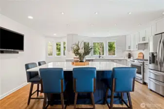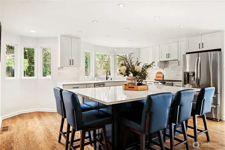 Gorgeous home on a quiet dead-end street, offering peaceful surroundings just minutes from everything. Expansive windows fill the home with natural light, highlighting the spacious step-down living room with a wall of floor-to-ceiling windows overlooking the serene backyard. The formal dining room is perfect for entertaining, while the fully updated chef’s kitchen features quartz countertops, stainless steel appliances, a large island, and informal dining area for everyday living. The inviting family room includes a gas fireplace and built-in shelving. The main-level primary suite offers an updated ensuite bath with dual sinks and marble finishes, complemented by two additional bedrooms and an updated hall bath. Enjoy a versatile outdoor oasis with patio spaces, covered pergola, BBQ area, grassy lawn, and treehouse. Additional features include A/C, boat/RV parking, storage shed, and access to Big Rock Park. Located in the Issaquah School District with easy access to I-90, Issaquah, Redmond, and the Cascade Mountains.