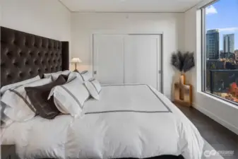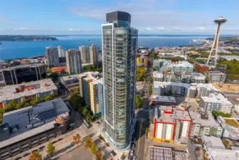 Celebrate luxury living at Spire — Seattle's premier condominium at the heart of South Lake Union, Belltown, and Denny Triangle. This exceptional 11th-floor, one-bedroom residence offers sunny southern exposure from floor-to-ceiling windows with breathtaking views of the city skyline. Residence #1103 is thoughtfully upgraded with $12,500 in custom finishes, including a designer kitchen island with added storage and seating. California closets and custom cabinetry in the bedroom and entry create seamless, functional living spaces. The L-shaped kitchen features premium Bosch appliances. Soaring 9-foot ceilings and expansive windows create an airy, lofty home. The serene bedroom retreat extends to a private balcony — an intimate vantage above the city, perfect for morning sunrises and evening unwinding.Just moments from Amazon, Google, and Seattle's most celebrated dining and cultural destinations, including the Space Needle and Pike Place Market. This residence offers unparalleled access with a Walk Score of 98 — placing the best of the city at your doorstep! Spire's extraordinary amenities are world-class. The 40th floor offers panoramic views of the Space Needle, Lake Union, and Puget Sound. Wrap-around terraces feature BBQs, fireplaces, a full dining room and kitchen, and the exclusive Spire Club. The 41st floor features a fitness center, movement studio, theater, co-working spaces, and private conference rooms. Spire has the PNW's only fully automated parking system!