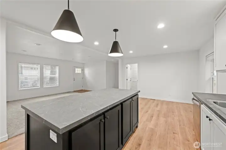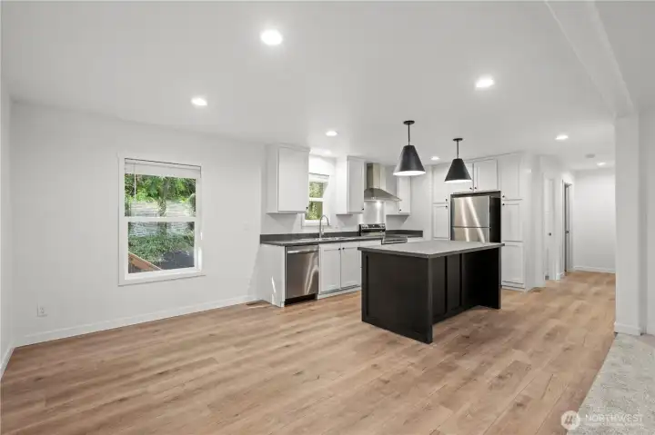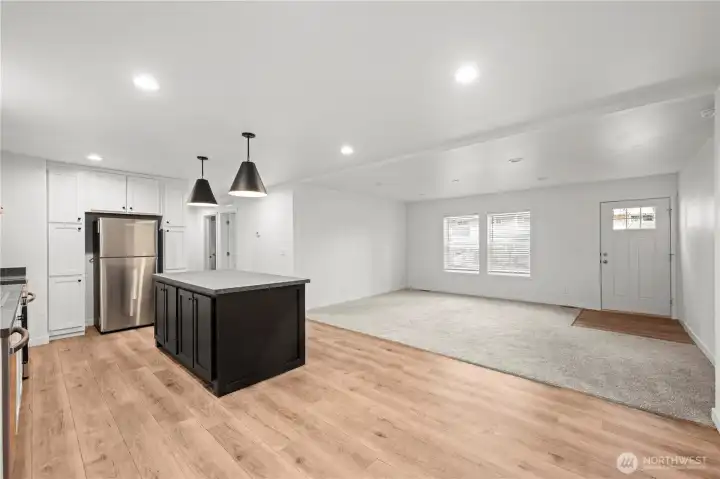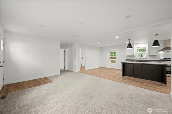 Large light filled living area with open kitchen concept