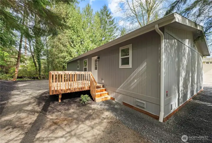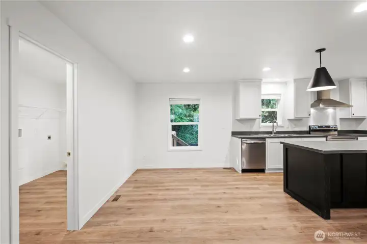 Large utility room off kitchen/dining area with door that leads to back deck,