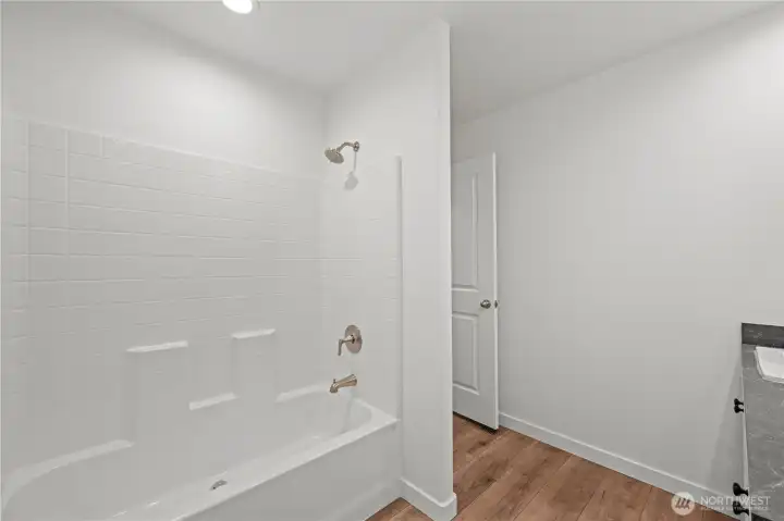Spacious shower in light filled primary bathroom