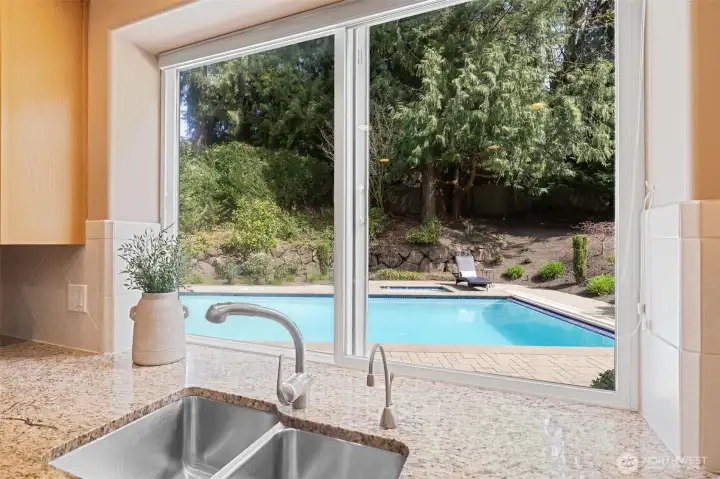 Gourmet kitchen with granite slab counter, stainless appliances and a walk-in panty.