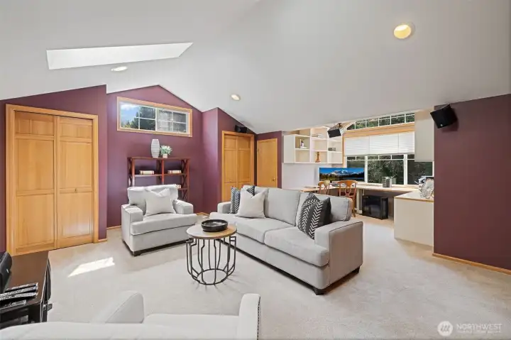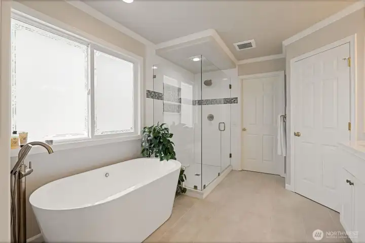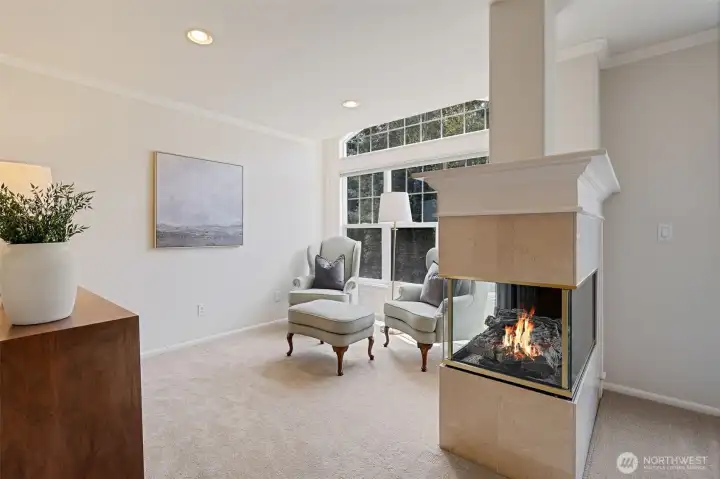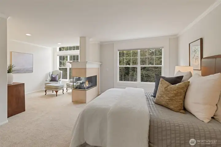 Primary suite with a gas fireplace, sitting area and a large walk-in closet.