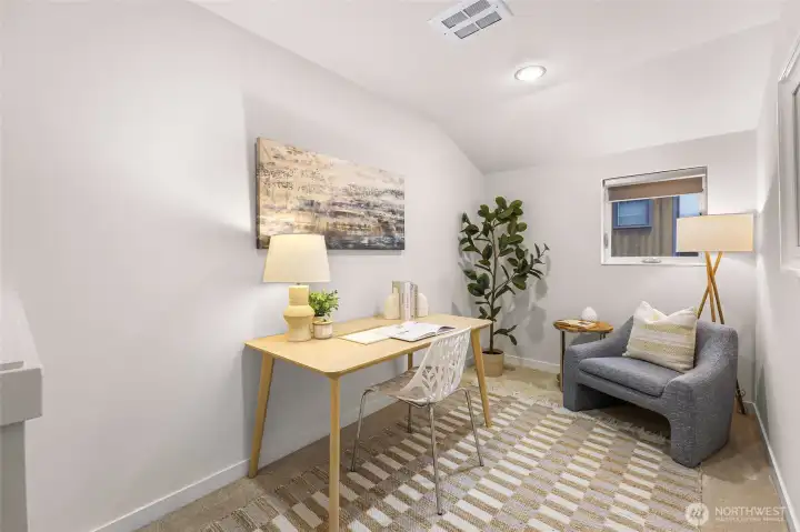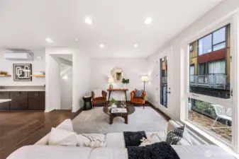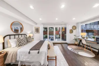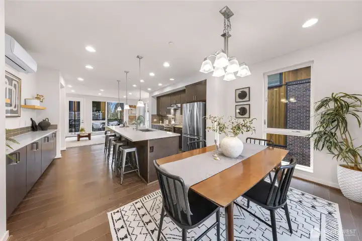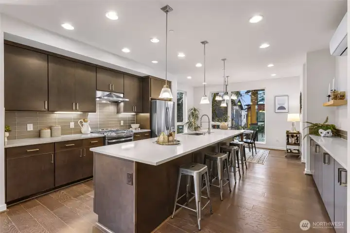 Modern and light-filled, this thoughtfully designed townhome offers airy 9-foot ceilings, floor-to-ceiling windows, and a layout that feels both spacious and inviting. The lower level features two generous bedrooms (or use one as a flex space/media room), a ¾ bath, in-unit washer and dryer, and direct access to a private patio garden. At the heart of the home, the open-concept main level is made for everyday living and easy entertaining, with a striking 12-foot quartz island, stainless steel appliances, and a 5-burner gas range. The living area, with engineered wood floors, opens to a large balcony. Upstairs, the primary suite feels like a true retreat, with a loft for a fitness area or home office, plus a beautifully appointed bath with double sinks, abundant storage, a soaking tub, and a separate frameless-glass shower with rain showerhead. Wired for ethernet with high-speed internet available, the home also includes one dedicated secure garage parking space with elevator access and just across from the stairs.Tucked along the interior courtyard of this distinctive community, the location offers nearby: Bryant Corner Cafe, Ridge Pizza, Top Pot, Starbucks, Grand Central Bakery, and the Northeast Seattle library. Top rated schools include Bryant Elementary, Eckstein Middle School, and Roosevelt High, Green Lake, University Village, Magnuson Park are close at hand. Bus Lines and Light rail, are minutes away. Welcome Home!